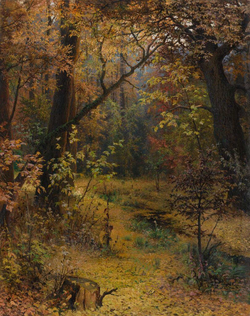Это пусть и менее известная, но очень необычная картина — лес выглядит не просто сказочным, но и зловещим. Юлий Клевер — русский художник немецкого происхождения, интересовался фольклором и мифологией. Кажется, здесь живут и лешие, и водяные. Болотная гладь отражает алую листву и кажется кровавой. А на ветке впереди уселась птица-вестник сорока-белобока. Есть и копия этой картины — «Березовая роща».