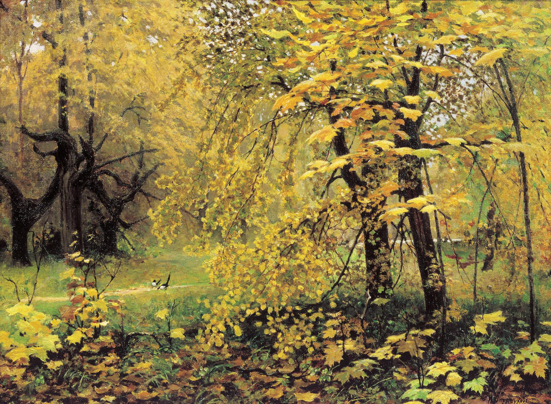 Еще одного художника-передвижника, как и Василия Поленова, вдохновила золотая осень в окрестностях подмосковного Абрамцева. Наверное, вы уже поняли: в это место непременно стоит отправиться именно в эту пору! Осень у Остроухова действительно царственная, великолепная и вместе с тем утонченная. Приятная деталь картины: две сороки на дорожке.
