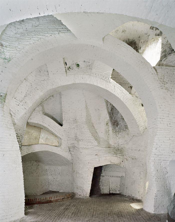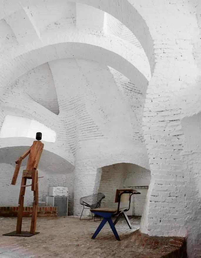 Для этой работы использовали строительные материалы — бетонный каркас, облицованный белой кирпичной кладкой. Эта форма и техника вызывают ассоциации с пещерными поселениями Каппадокии.