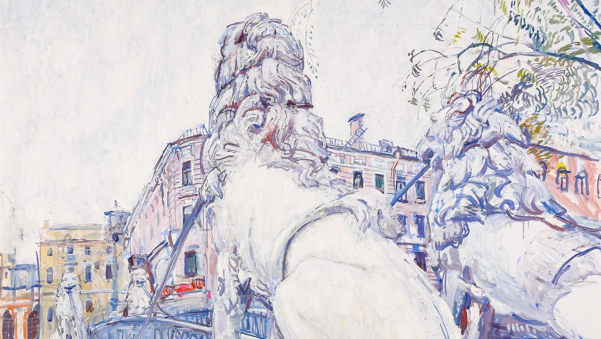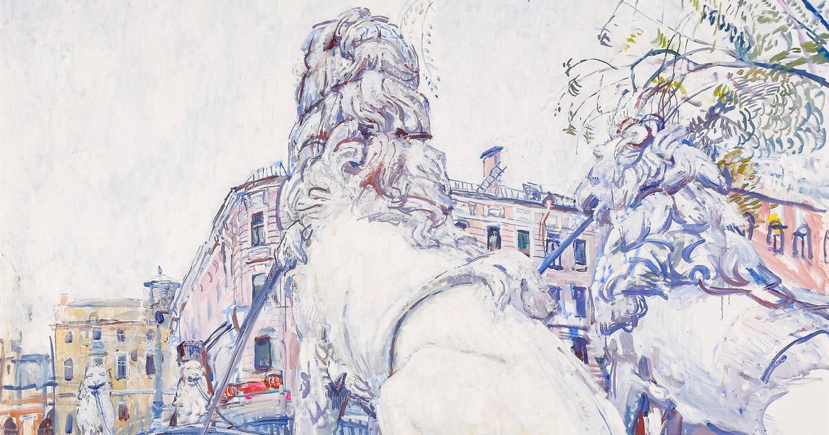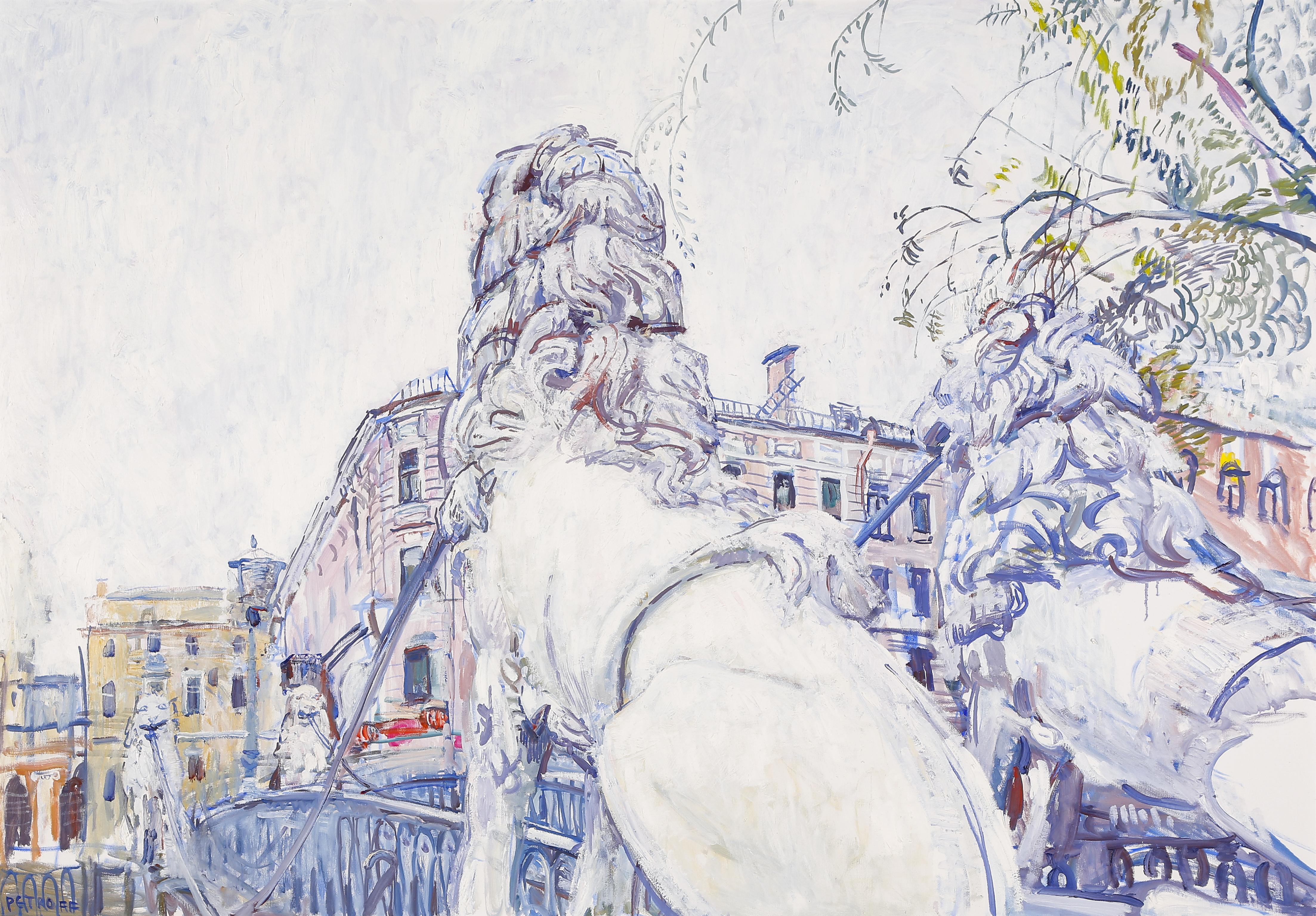 Скульптуры предстают в необычном ракурсе — художник показывает их со спины, выбирая низкую перспективу, благодаря чему фигуры устремляются вверх. Мощные львы становятся защитниками тихих городских улиц, создающими ощущение величественности белой ночи.