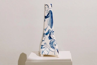Эти работы можно и нужно рассматривать вблизи, чтобы оценить смелость мазка и тонкость цветовых решений, которые продолжают идеи, заложенные в графике Александра Траугота. Сюжеты — самые разные: вот Кот Бегемот пойман за столом с другими героями Булгакова на вазе «Мастер и Маргарита», вот театральная зарисовка на пузатой вазе, вот на геометрично вазе «Танго» сплетаются руки страстных танцоров, а вот причудливой формы «Лукреция» заставляет задуматься об образе женской красоты и доблести.