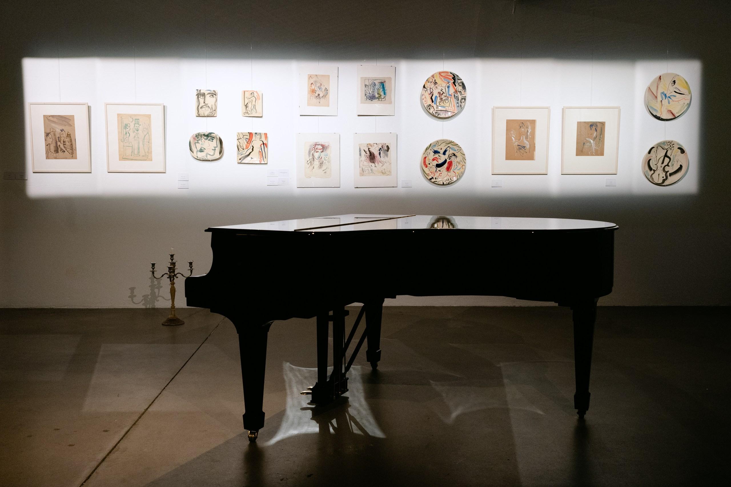 На одной из стен второго зала экспозиции вперемешку вывешены фарфор и живопись, представляющие сцены из поездки Александра Траугота в Париж. Эта серия работ по фарфору — пример того, как художник переносит свою живописную и графическую эстетику на новый материал. В этих предметах проявляется изысканный цвет и та самая «живая линия», которая извивается, создавая сложные, почти музыкальные ритмы.