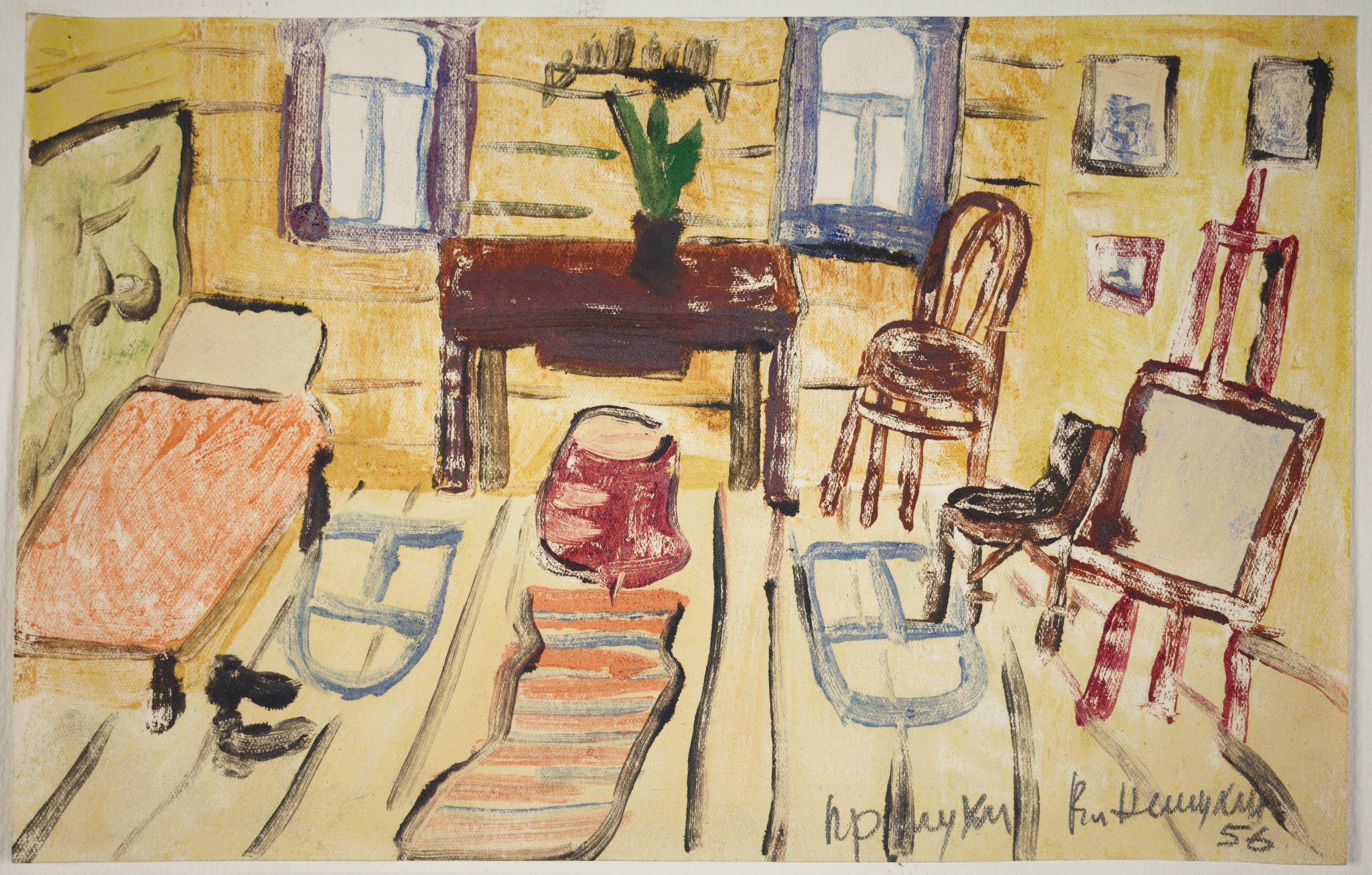 В. Немухин. «Прилуки. В большой комнате». 1956 г. Бумага, цветная монотипия.