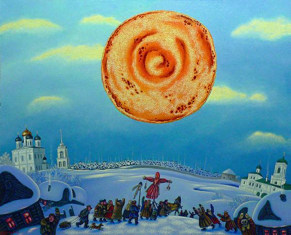 А самый, пожалуй, необычный по стилистике цикл масленичных картин — «Псковская Масленица» Игоря Шаймарданова из Санкт-Петербурга, который работает также как театральный художник и регулярно бывает в Пскове. Местами работы выполнены в коллажном стиле, а блин заменяет собой солнце.