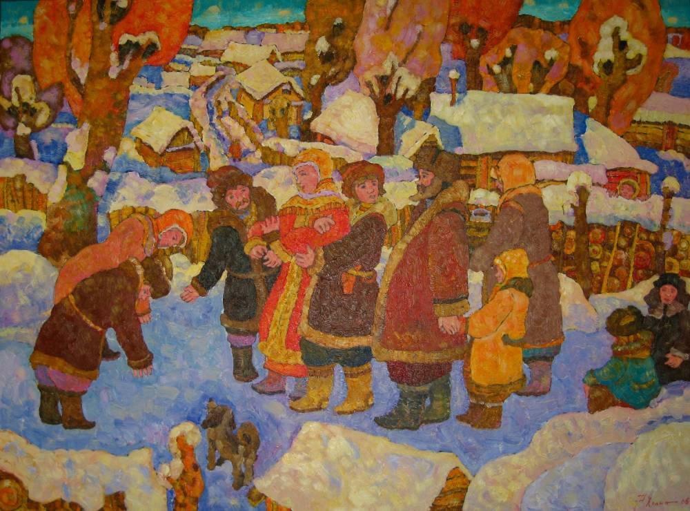 А сзади — заснеженные березы, темная полоса хвойного леса и непременные купола храма. Цвета охры, дерева, пестрые костюмы, в которых много красного — цвета жизни и солнца — создают праздничное настроение проводов зимы.