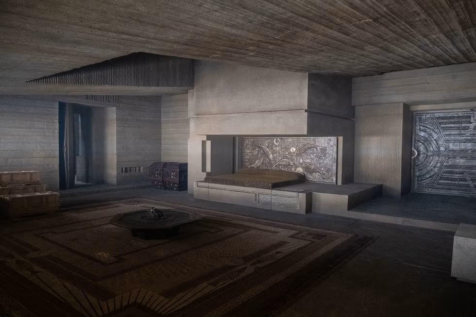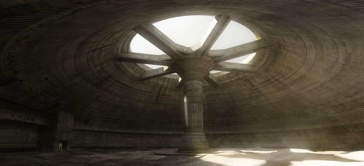 Как бы выглядели постройки на Арракисе, где бушуют песчаные бури и рыщут гигантские черви? Ответом стали города, встроенные в горные чаши, и здания с массивными наклонными стенами, защищающими от стихии.