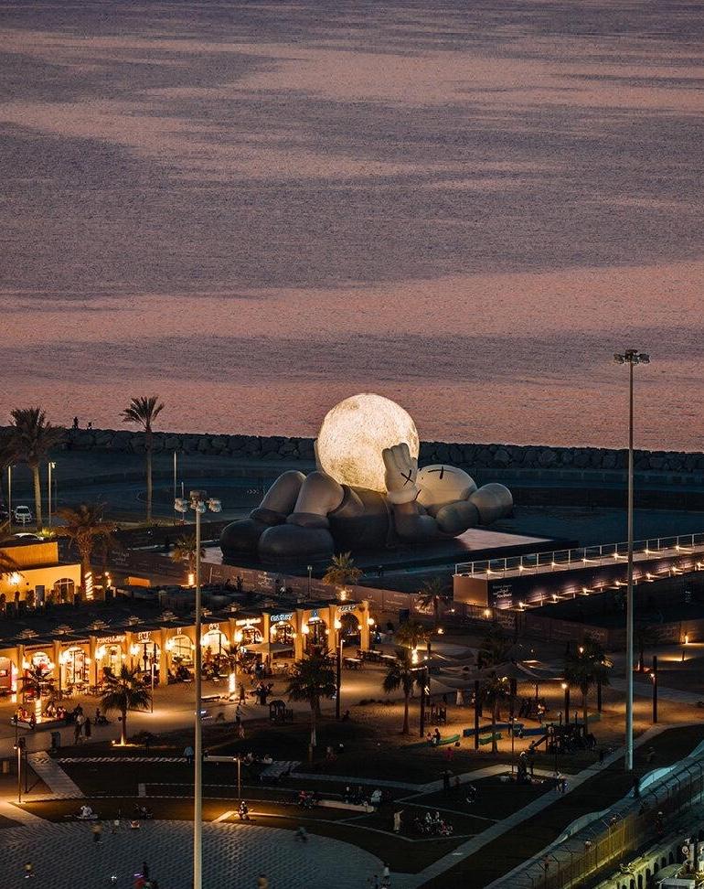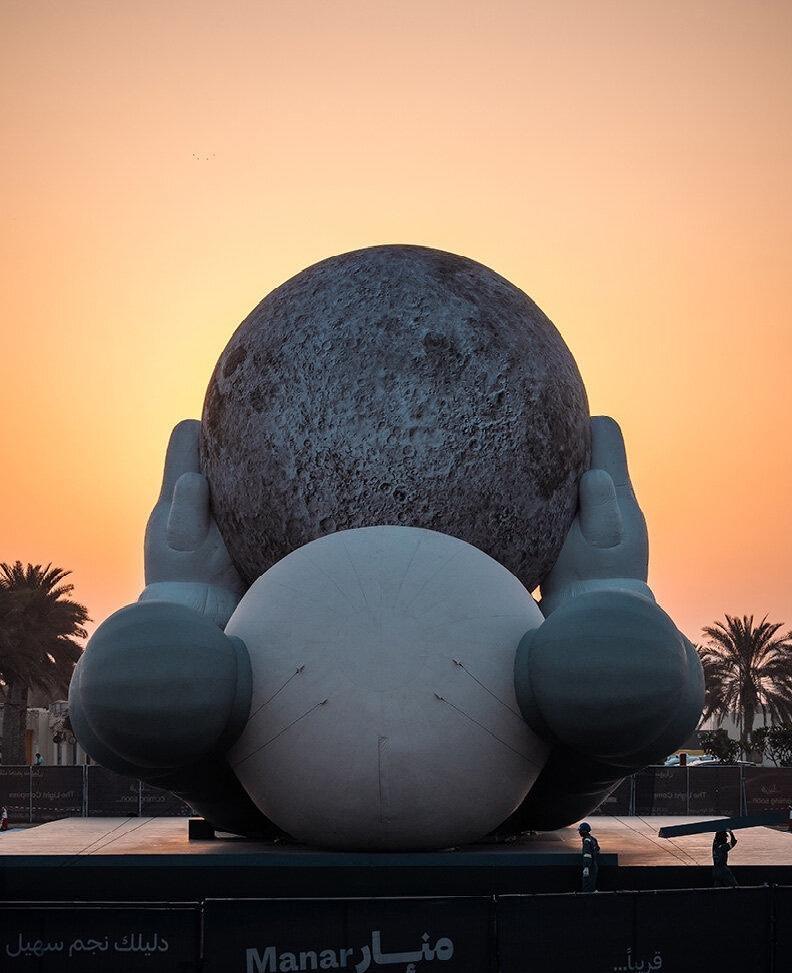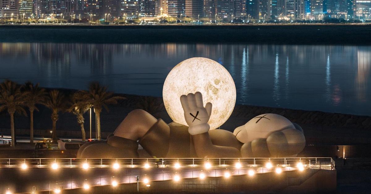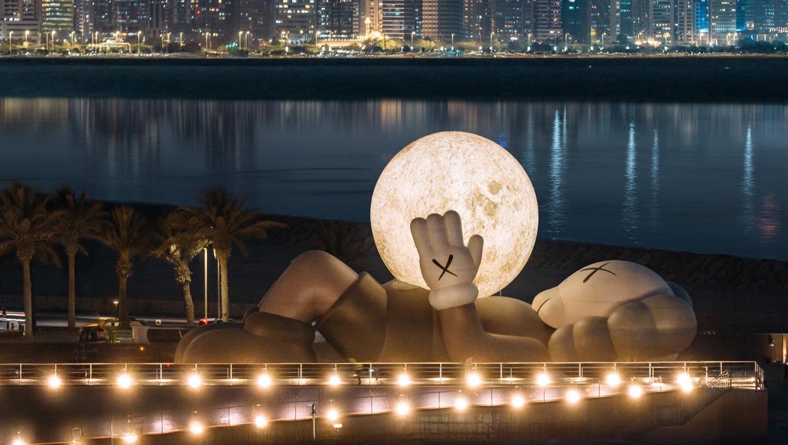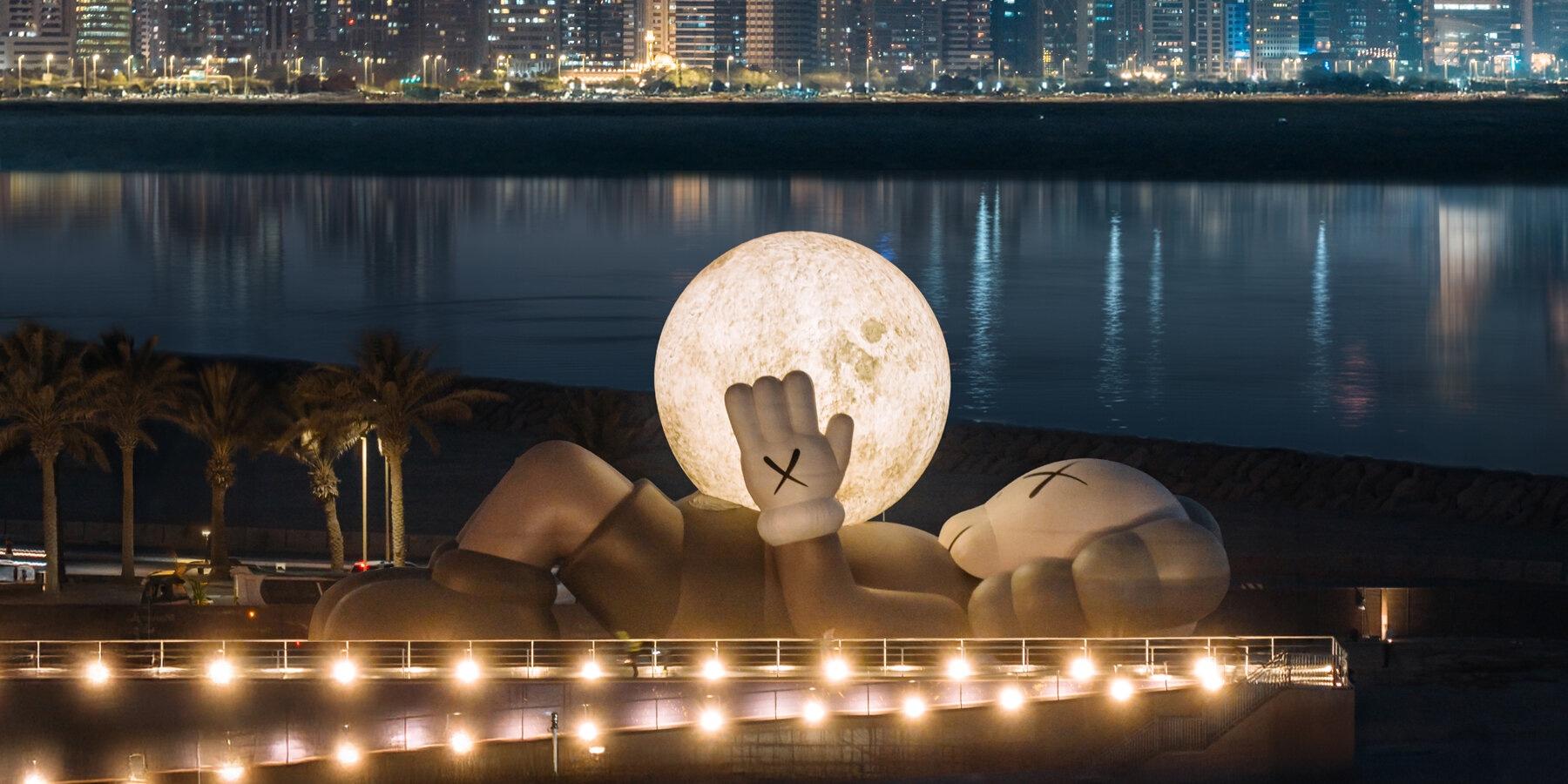 Лежащий на спине персонаж KAWS держит в руках полную луну. Этот символ напоминает о том, что парусные суда, когда-то бороздившие воды залива, полагались в пути на звезды и положение Луны. Фигура становится ключевым образом выставки, соединяя прошлое Персидского залива с таким медиумом, как свет.