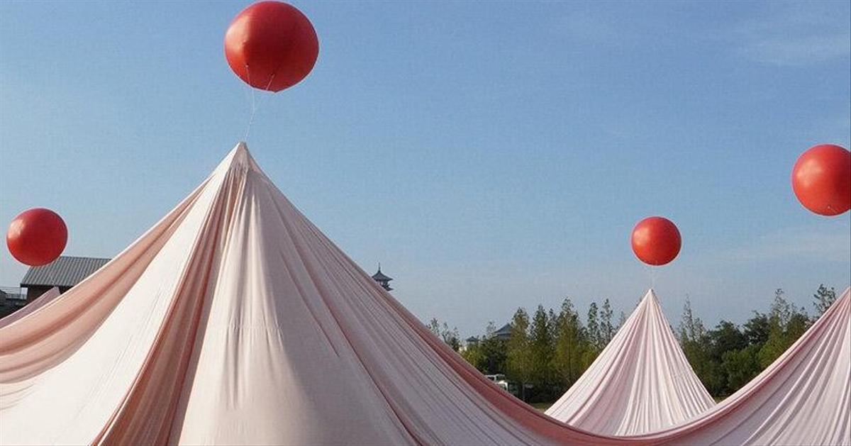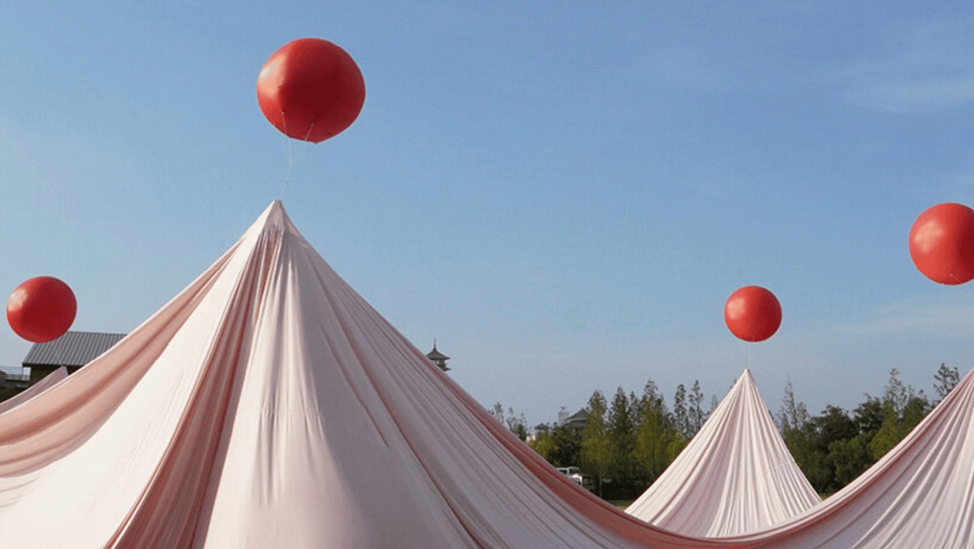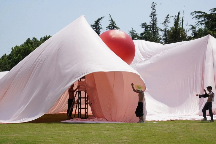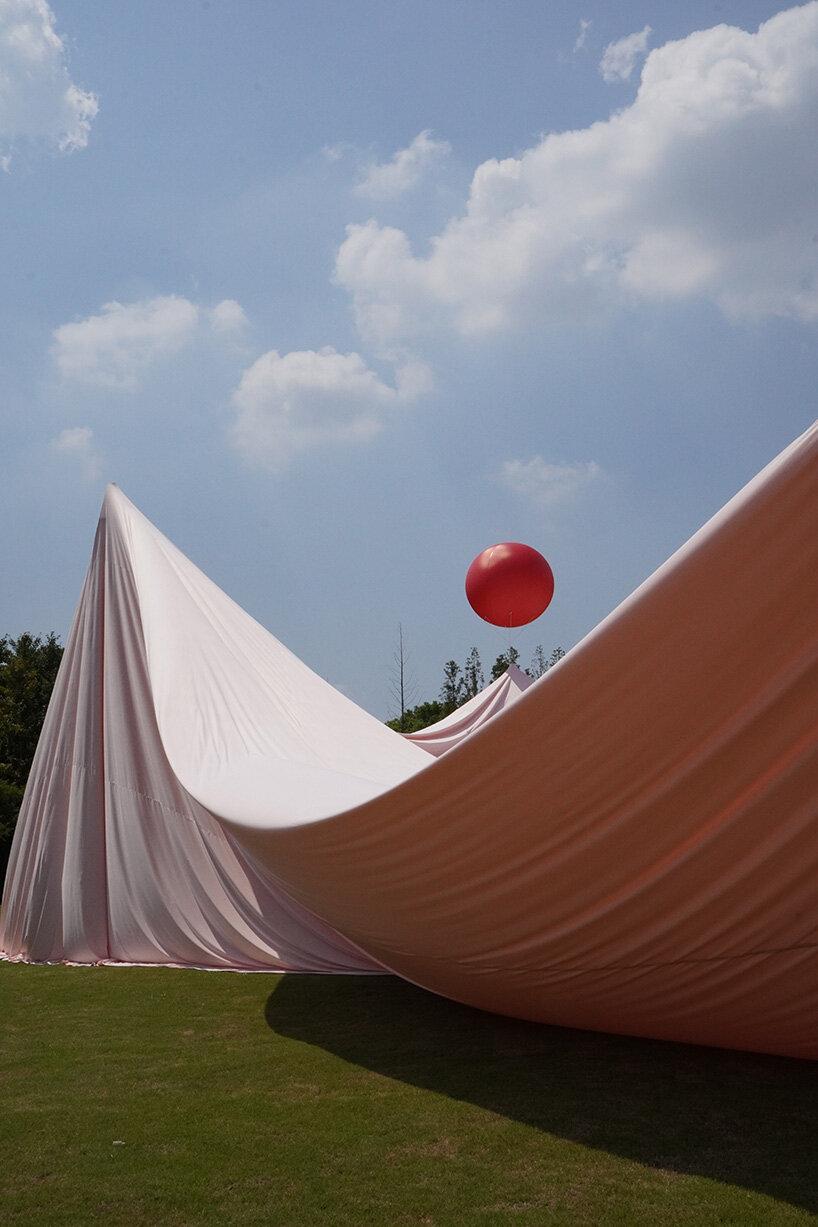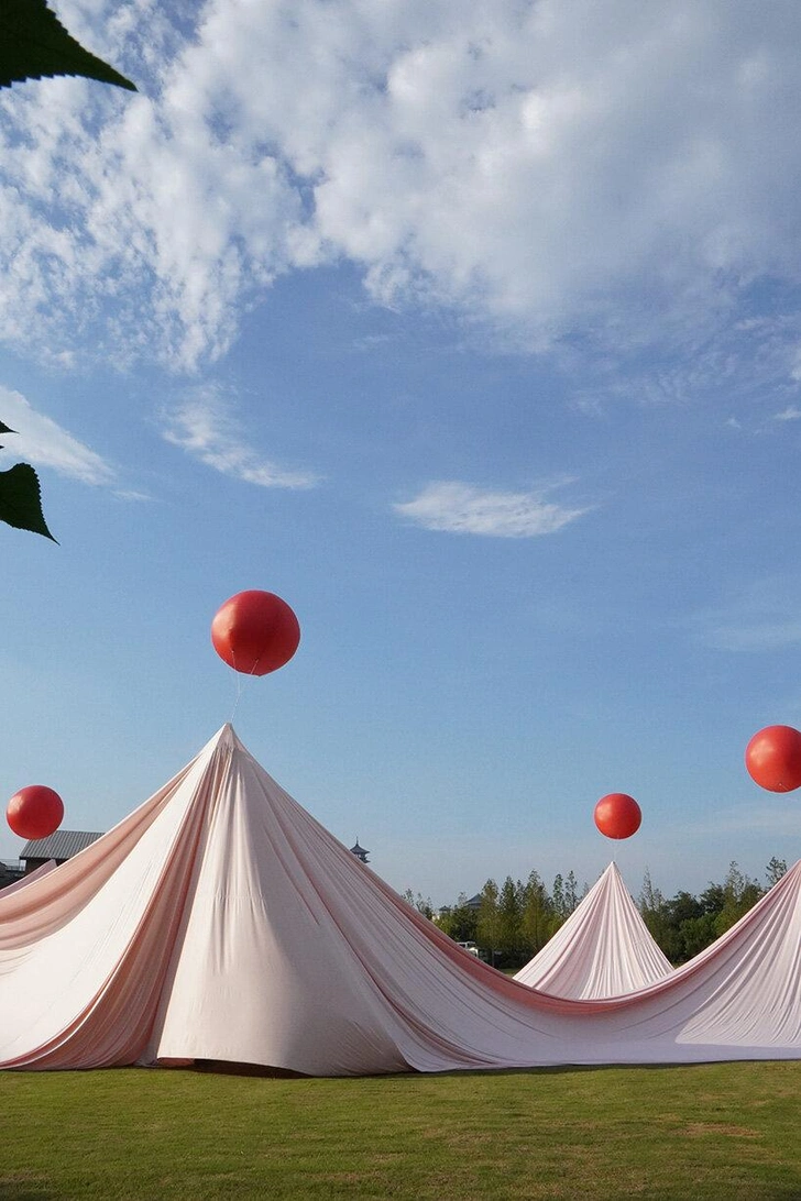 Они покрыли землю тканью и в некоторых точках закрепили красные воздушные шары. Получается красивая объемная драпировка, создающая необычные пространственные ощущения. Задуманная для свадебного торжества, инсталляция становится не только красивым фоном для фотографий, но и детской площадкой — всем гостям здесь весело.