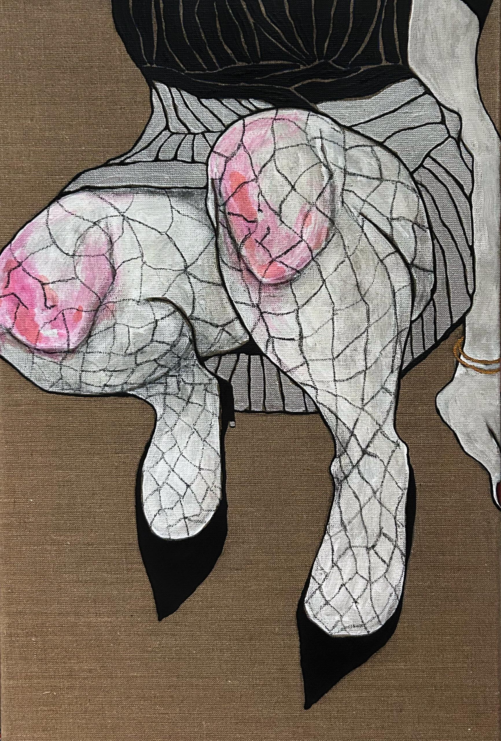 В первую часть экспозиции вошло 16 маленьких монохромных холстов, посвященных ощущениям женщины в отношениях — мучительным и физически, и морально. Архитектура экспозиции продемонстрирует два возможных выхода из этого состояния: реальную смерть или душевный раскол, либо трансформационный, ведущий к внутреннему спокойствию.