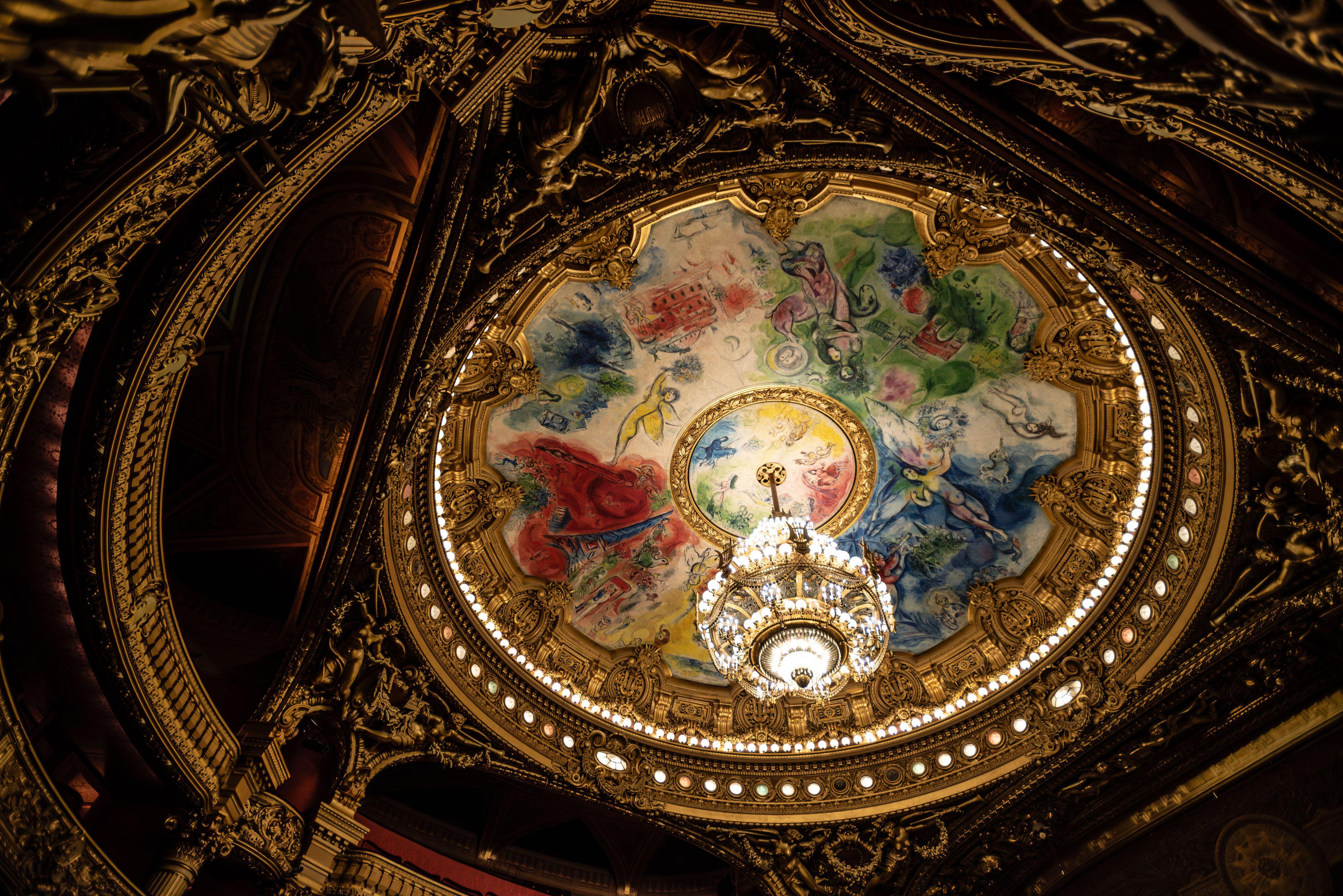 В 1964 году 77-летний Шагал получил большой заказ от министра культуры Франции Андре Мальро. Он попросил художника расписать плафон парижской Оперы Гарнье. На 220 м2 ушло 200 кг краски! Шагал изобразил 9 сюжетов культовых опер и балетов: «Пеллеас и Мелизанда» (Клод Дебюсси), «Борис Годунов» (Модест Мусоргский), «Волшебная флейта» (Вольфганг Амадей Моцарт), «Лебединое озеро» (Петр Чайковский), «Жизель» (Шарль Адан), «Жар-птица» (Игорь Стравинский), «Дафнис и Хлоя» (Морис Равель), «Ромео и Джульетта» (Гектор Берлиоз), «Тристан и Изольда» (Рихард Вагнер). Здесь есть персонажи и других произведений. Еще на росписи можно заметить парижские достопримечательности.