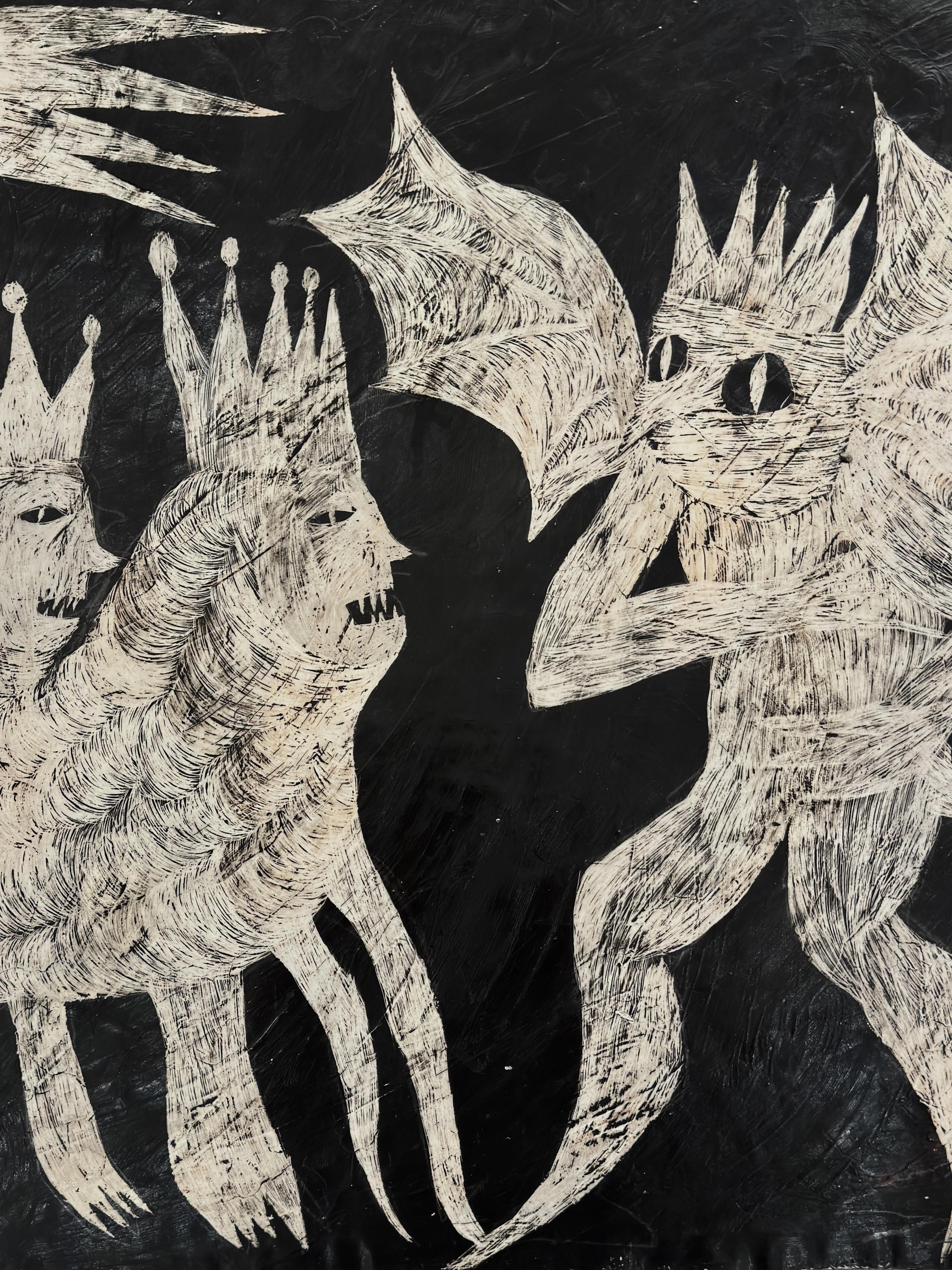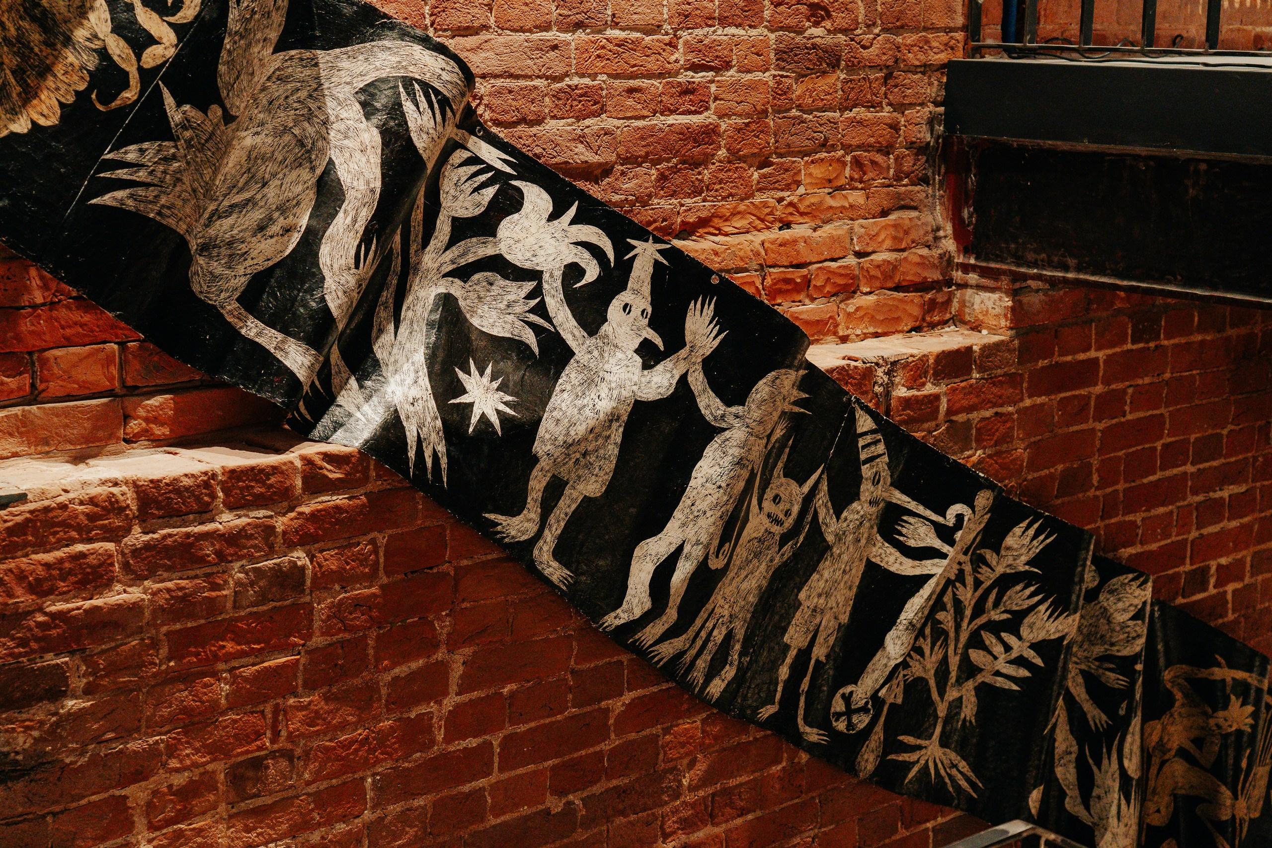 Текстиль Людмилы Барониной разворачивает мотив поиска и взросления во вселенной абсурда, ковры Вадима Михайлова работают с орнаментом, повтором и смещением культурных кодов, деревянная скульптура Ульяны Подкорытовой обращается к метаморфозе и вымышленной архаике, а объект Ирины Кориной изображает разочарование и утрату утопических надежд.