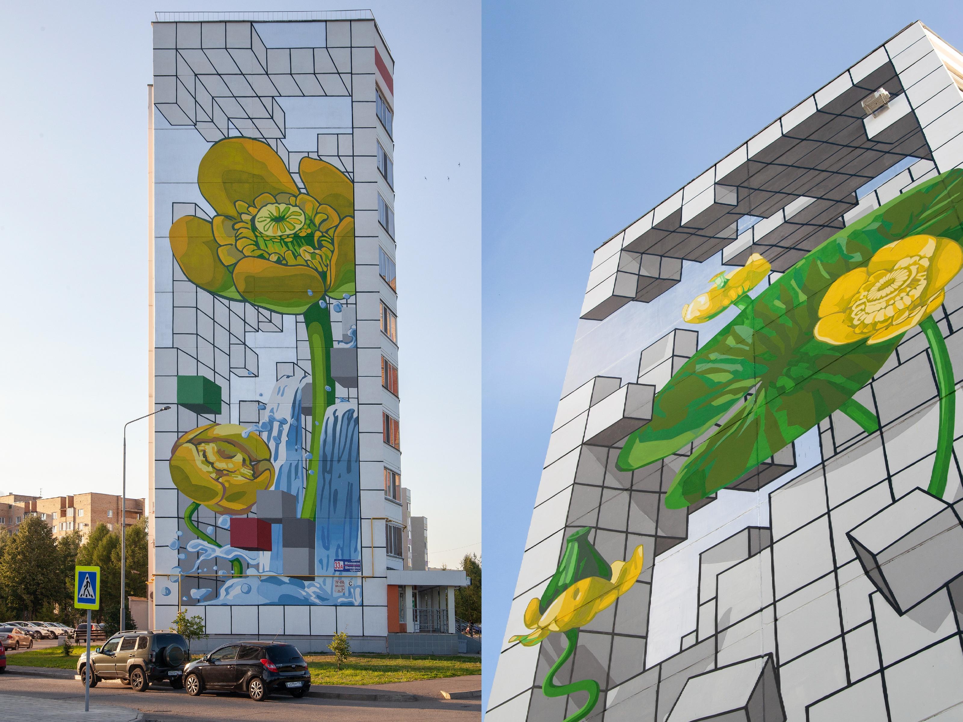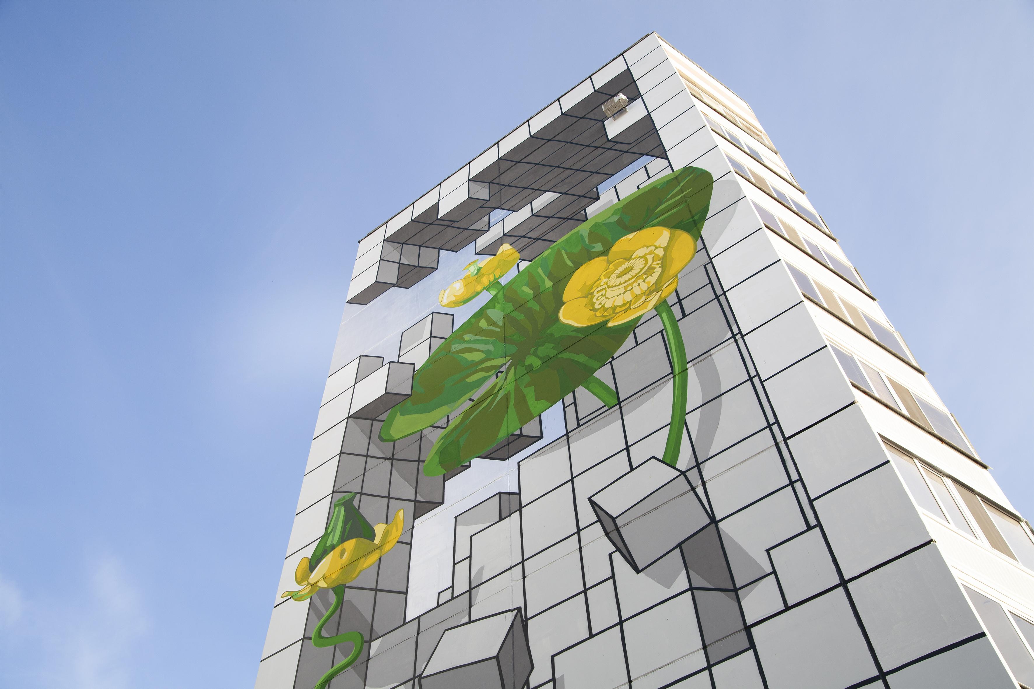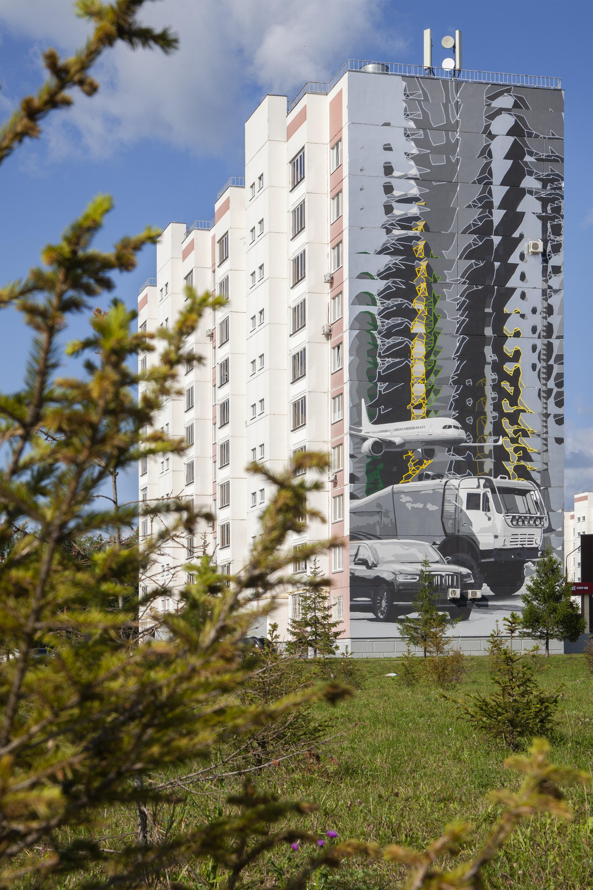Для работы над серией муралов был приглашен Артем Стефанов (STFNV) — известный российский художник-монументалист и мастер оптических иллюзий. Полиптих, органично встроенный в геометрию и ритм типовой архитектуры, стал единым художественным полотном, где каждый мурал — глава общей истории о том, как в индустриальном городе рождается, расцветает и сохраняется жизнь.