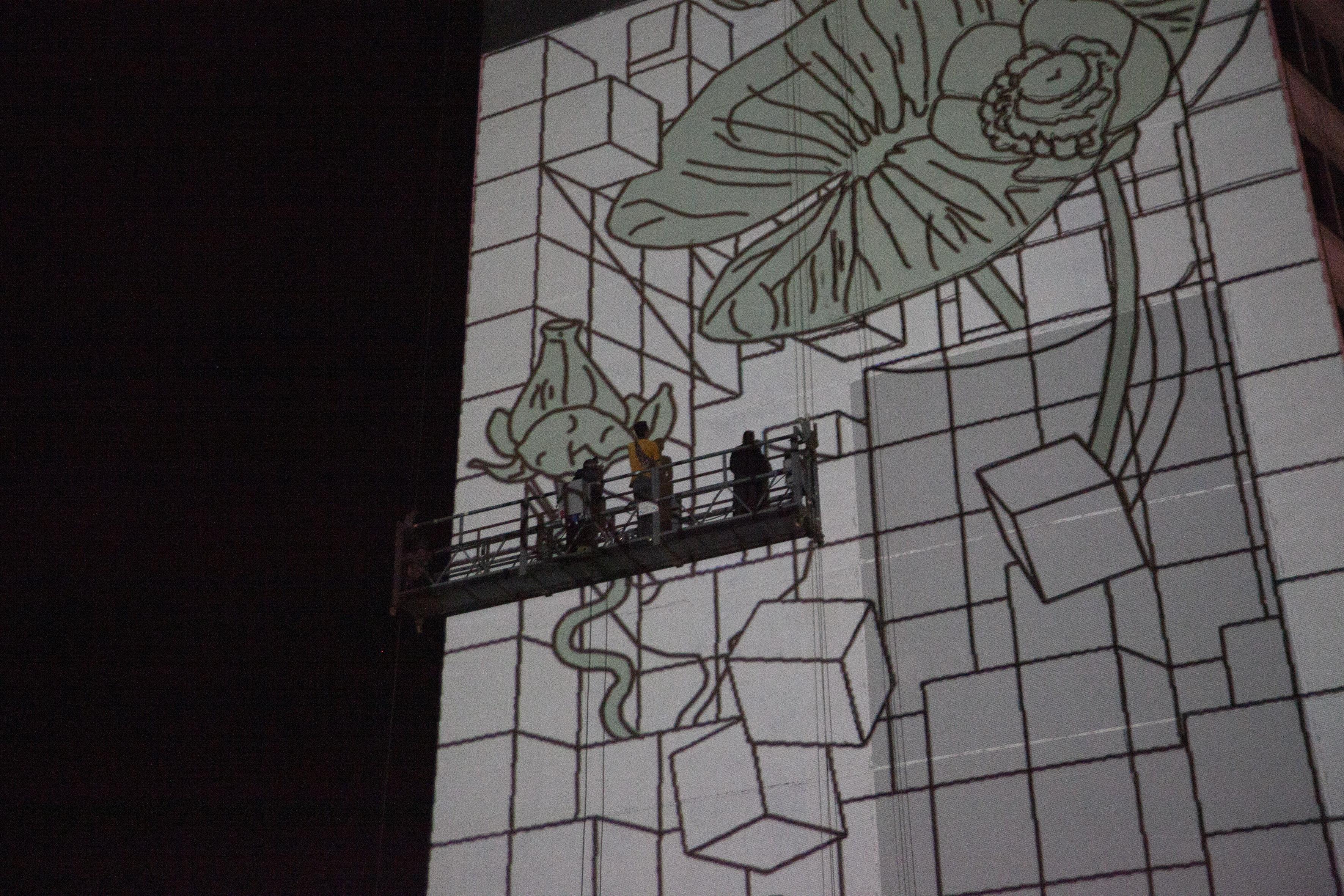 В полиптихе художник использует оптические эффекты и изометрию: плоские изображения кажутся объемными, а при взгляде с определенной точки изображения собираются в единую композицию. Дополнительное измерение формирует светоотражающая краска — она создает иллюзию неба в муралах и меняет их в зависимости от времени суток и погоды.