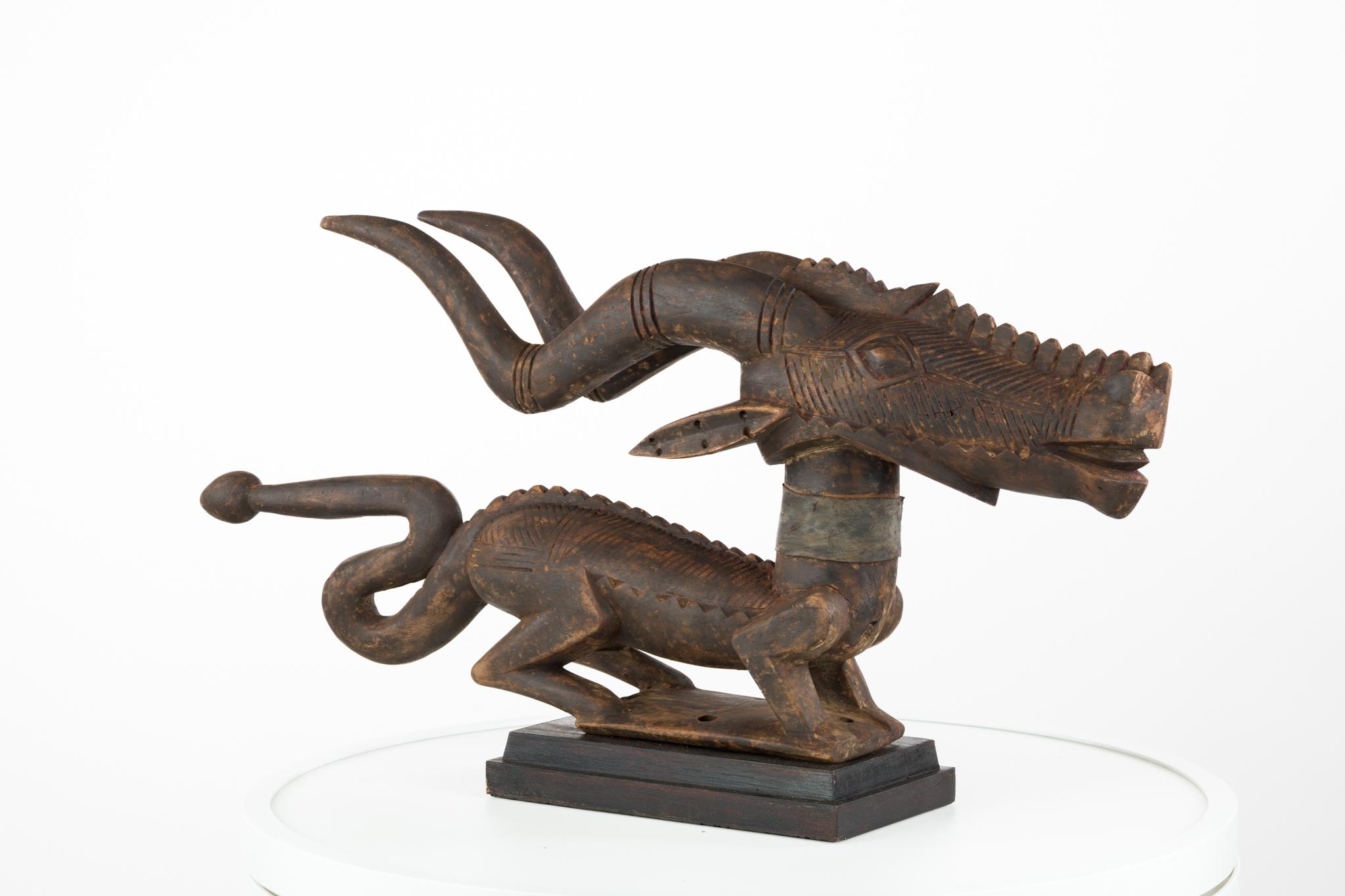 Наголовник с изображением священной антилопы чивара для сельскохозяйственных обрядовых праздников. Дерево, кожа. Бамбара, XIX–XX вв. Мали