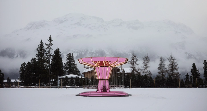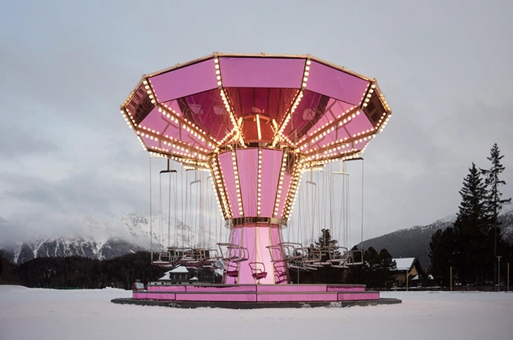 Розовая карусель — что тут необычного? С виду кажется, что ничего: яркие лампочки, классический силуэт… Но Карстен Хеллер (Сarsten Höller), знаменитый концептуальными аттракционами, просто так бы ее не сделал. Художник хотел не просто прокатить людей на карусели из детства, а поиграть с восприятием пространства и времени. Место для этого подходящее: отель Kulm в Санкт-Морице, вокруг леса, горы, рядом каток… Все это отражается в розовых зеркалах.