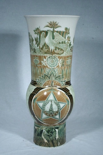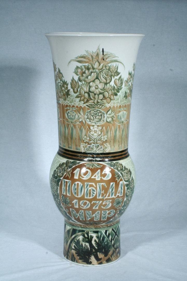 Ваза декоративная «Победа и Мир». Ленинградский фарфоровый завод имени М. В. Ломоносова. 1975 г. Автор росписи: Городецкий В. М. Фарфор, роспись подглазурная. Всероссийский музей декоративного искусства