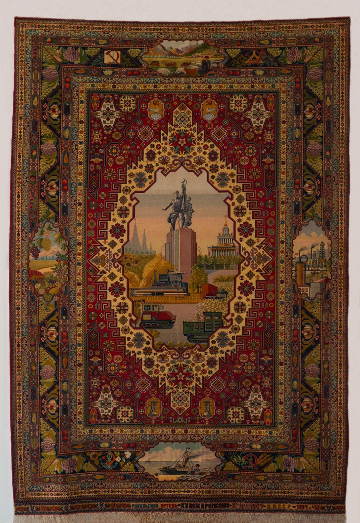 Ковёр ворсовый «ВСХВ». Дагестанская АССР. Рукельская артель. 1954 г. Нити шерстяные, нити хлопчатобумажные. Ручная работа, ткачество ворсовое ручное. Всероссийский музей декоративного искусства