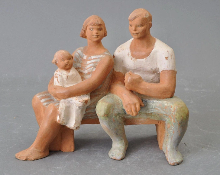Е. Гатилова. Скульптурная композиция «Молодые родители». Конец 1960-х годы. Терракота, роспись ангобом. Всероссийский музей декоративного искусства