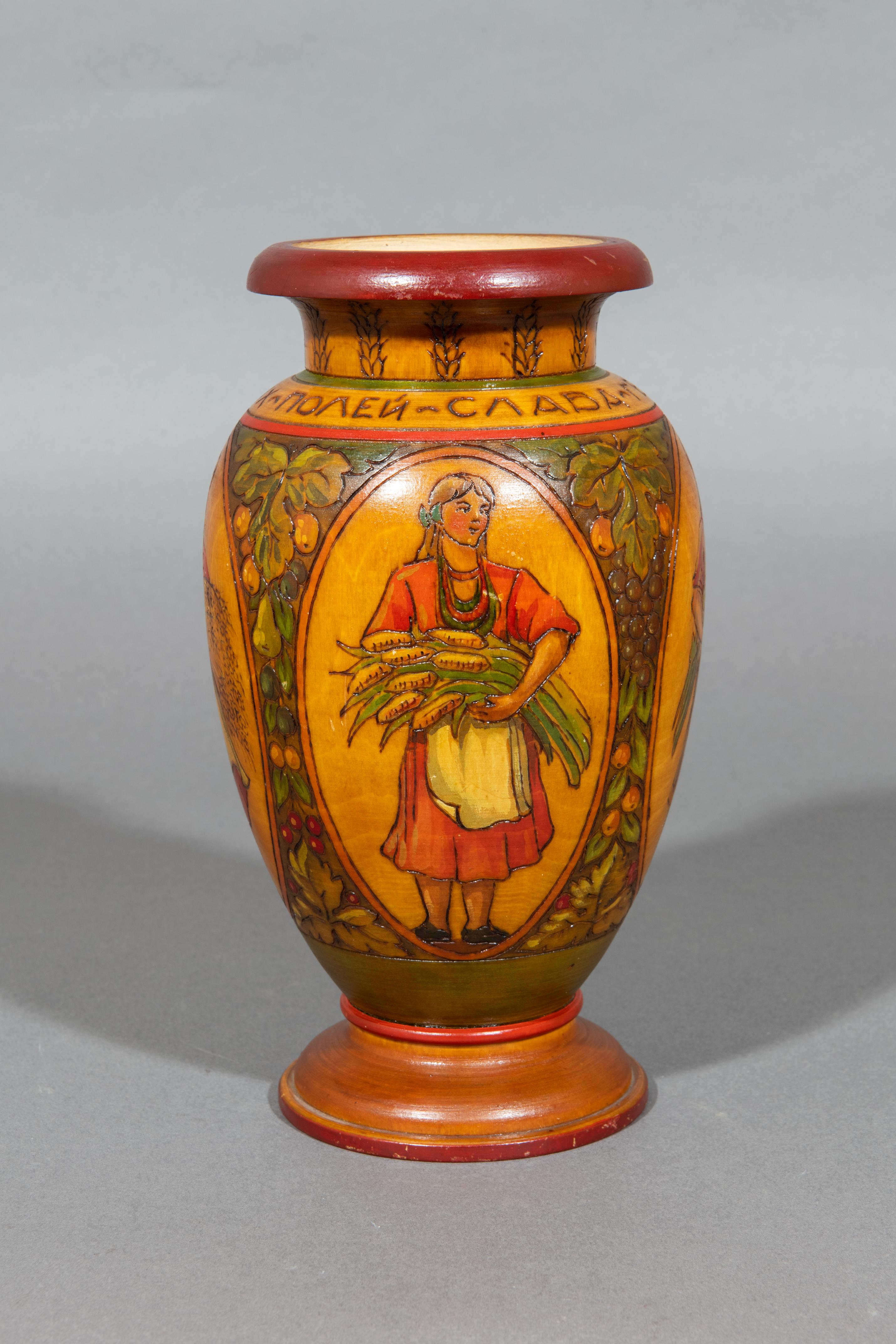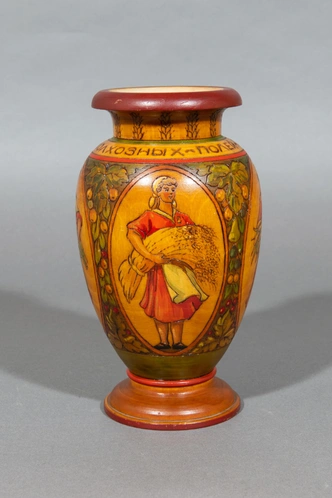 Ваза «Слава героиням колхозных полей». Скубенко Н. Б. (1916 — ?). Московская область, г. Загорск, артель им. Красной Армии. 1951 год. Дерево, краска, лак; точение, выжигание, роспись, лакировка. Всероссийский музей декоративного искусства