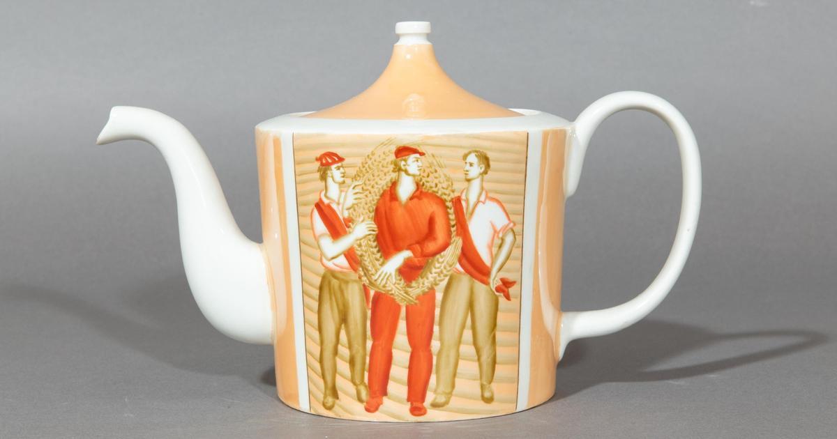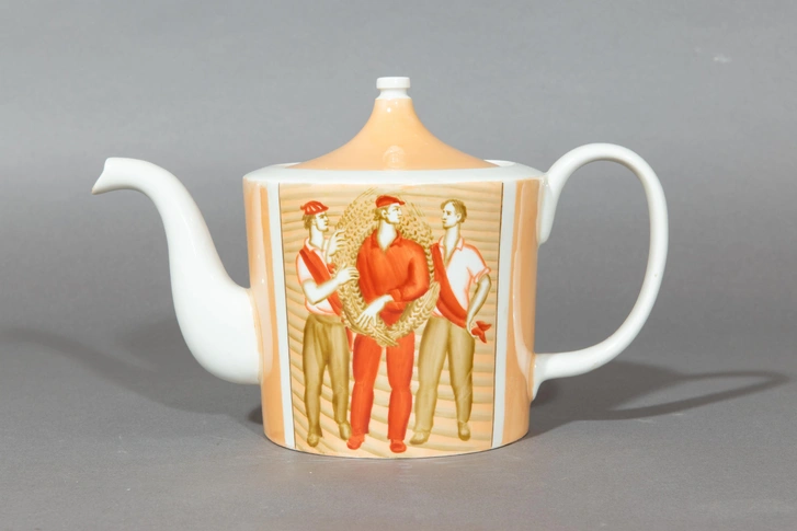Чайник. Из сервиза чайного «Большой хлеб» Краснодарский фарфоро-фаянсовый завод «Чайка». 1979 г. Автор росписи: Горбунов Ю. Н. Фарфор, крытье надглазурное, роспись надглазурная, люстр, позолота. Всероссийский музей декоративного искусства