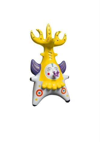 Каждый объект на выставке — современное художественное переосмысление игрушки. Это и возрождение древнейших резных деревянных кукол-оберегов, бытовавших на Русском Севере, и детские воспоминания о дымковской игрушке, плюшевом медведе и лошадках-качалках, выраженные в живописи и фарфоре.