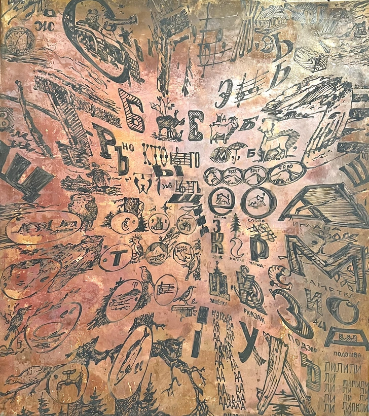 Сергей Бугаев. «Скопление букв и образов # 144», 2025. Фольгированный текстолит, травление, 110х100