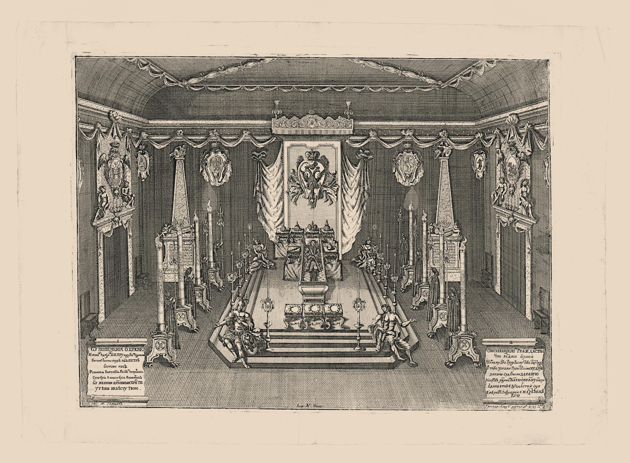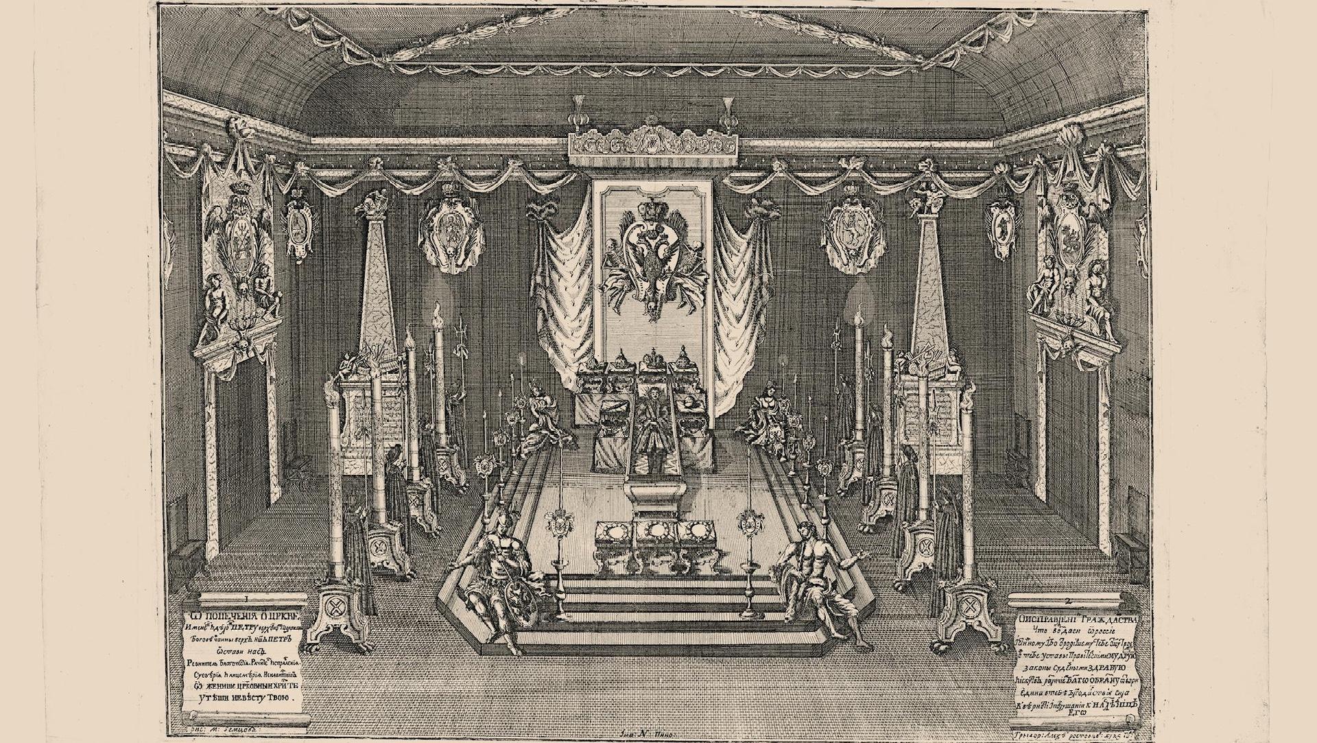 Печальная зала Петра I в Зимнем дворце. Гравюра (по рисунку Михаила Григорьевича Земцова). Алексей Иванович Ростовцев. 1725. Бумага; офорт, резец