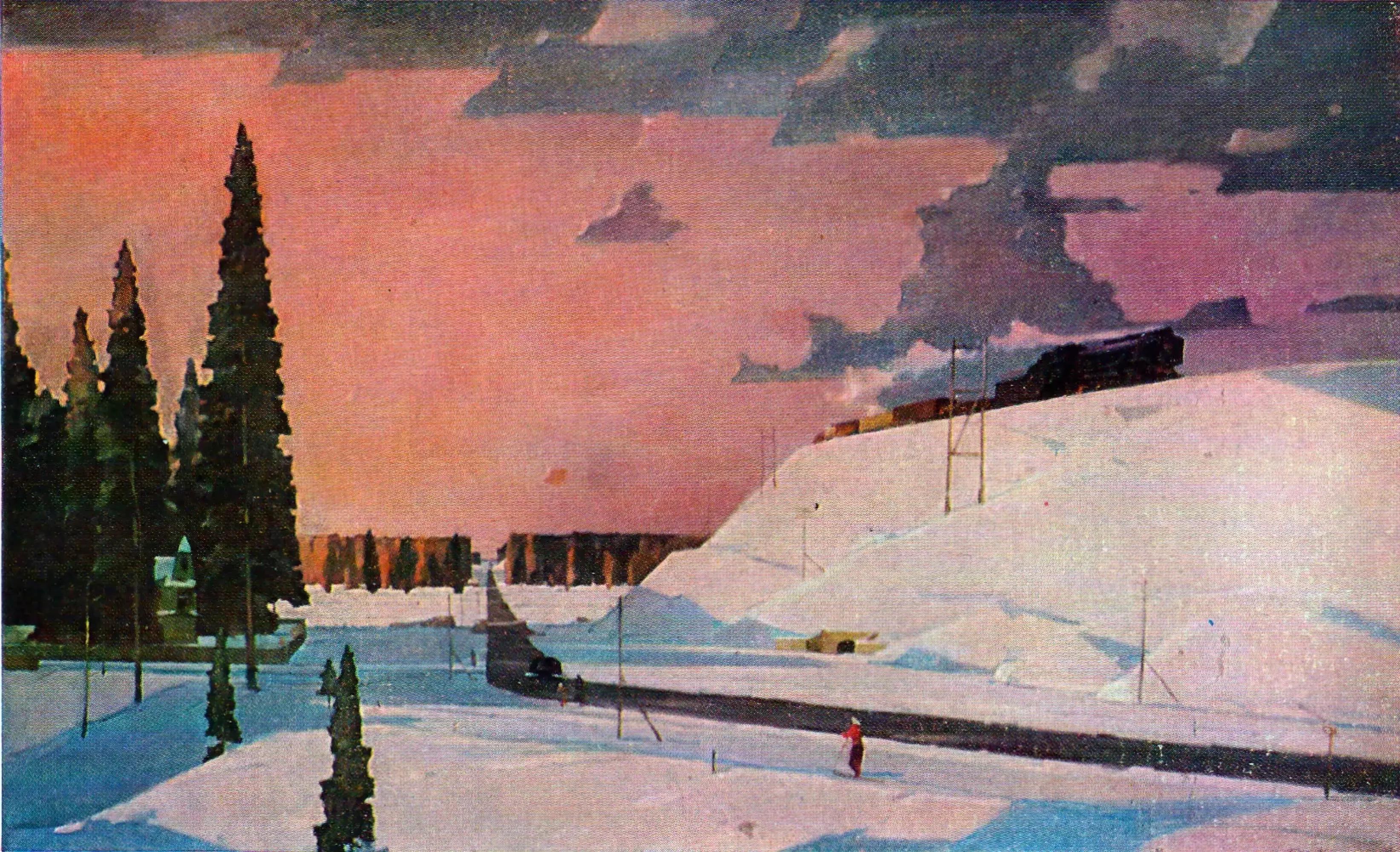 Заснеженный холм, два лыжника на переднем плане, внизу улочка городка, паровоз на железной дороге, чей дым сливается со снегом, купола церкви и белоснежное поле, которое сливается с потрясающего цвета небом. Маленькие фигуры людей подчеркивают масштаб зимней природы.