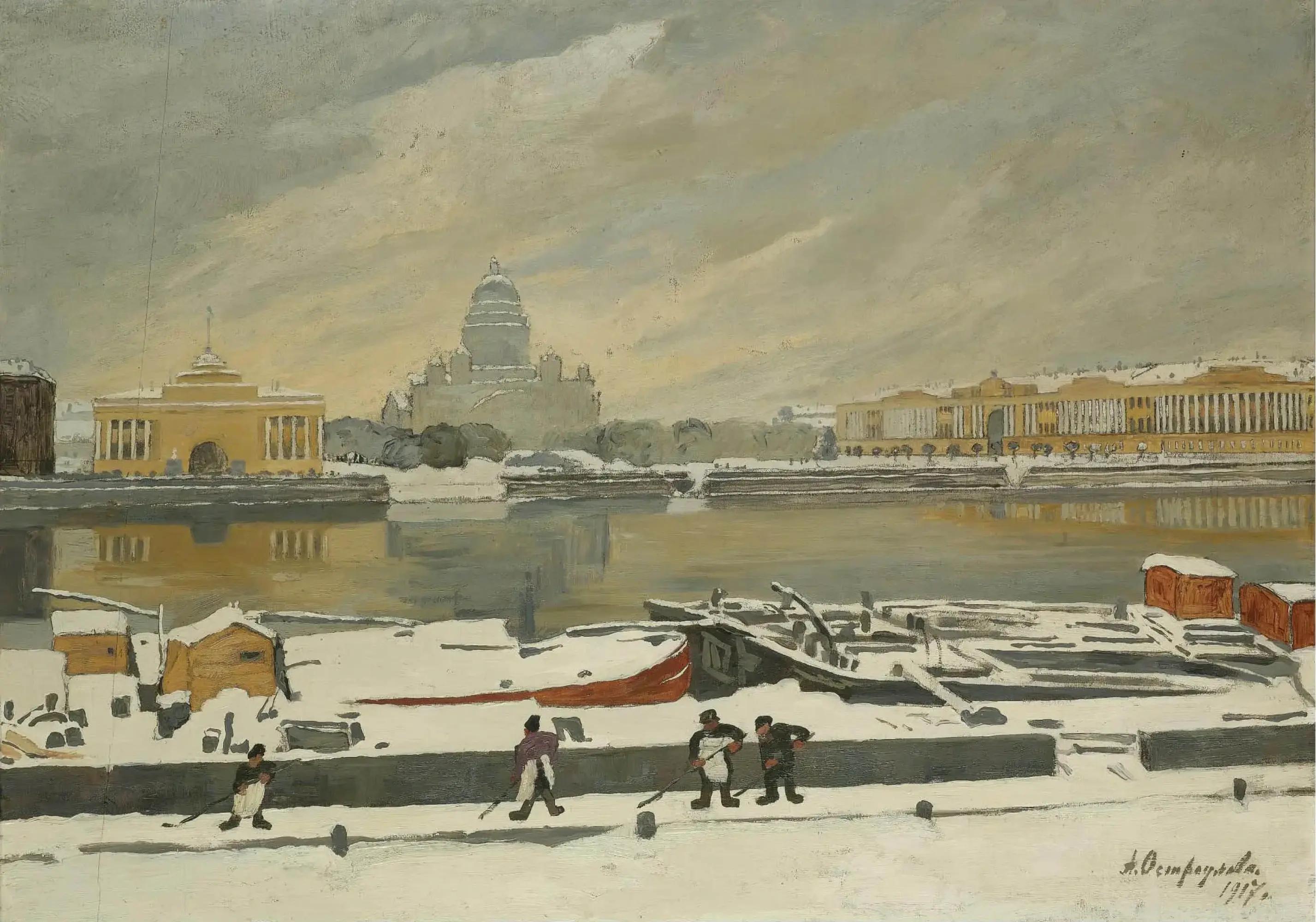 Городской пейзаж Петрограда в дни глубокой осени: тонкий слой свежего снега, серо-голубой воздух, дома и набережные, растворяющиеся в холодной дымке. Фигура человека и архитектурные детали вписаны в мягкий, немного приглушенный колорит, который передает ощущение тишины и хрупкости первых снежинок. А ведь в эти дни в стране случился масштабный переворот, определивший судьбу на десятки лет вперед…