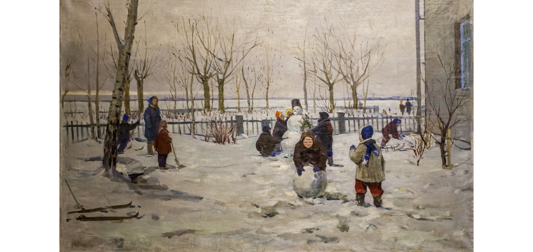 На картине изображен двор недалеко от набережной Архангельска в серый морозный день. Но пасмурная погода не смущает неугомонных детей, которые лепят снеговика. Это вообще одна из характерных тем послевоенной советской живописи, когда досуг и городская жизнь становились важным элементом бытового пейзажа