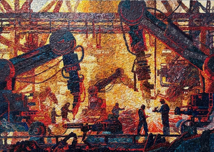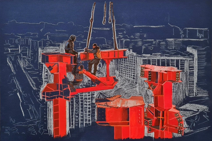 Выставка «Искусство труда» — масштабный проект, который завершает программу фестиваля «Время, вперед!». На протяжении 2025 года российские художники и скульпторы посещали заводы и фабрики в разных регионах, наблюдали за производственным процессом и на основе этих впечатлений создавали свои произведения.