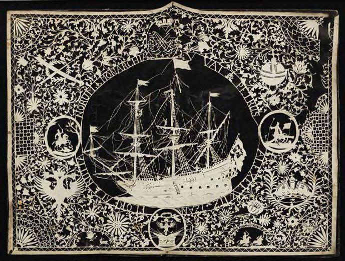 «Это вырезанный вручную силуэт из бумаги, созданный неизвестным североевропейским мастером. Вероятно, он был привезен в Россию Петром I или его ближайшими соратниками — например, светлейшим князем Меншиковым — после первой заграничной поездки царя в Европу. Подобные силуэты высокой тонкости производились в Северной Европе в конце XVII — начале XVIII века, но даже в крупнейших отечественных музеях, включая Эрмитаж, ничего подобного в виду хрупкости исполнения и редкости увидеть нельзя», — рассказывает куратор Сергей Подстаницкий.