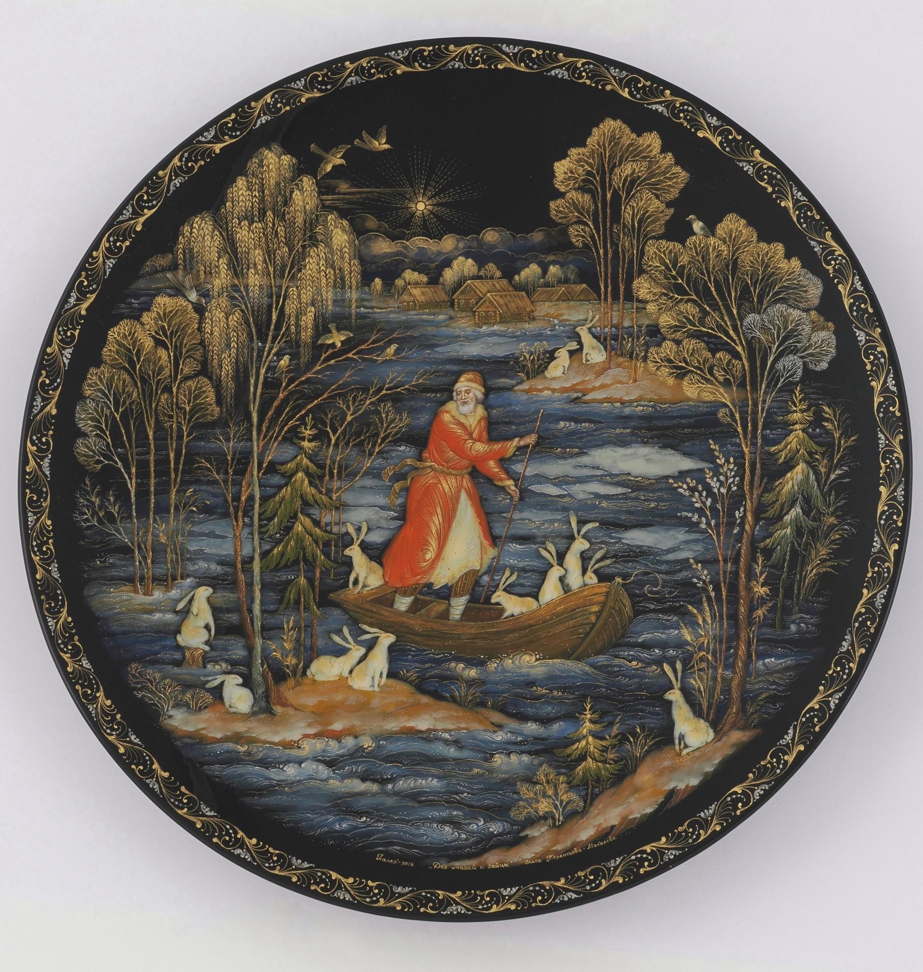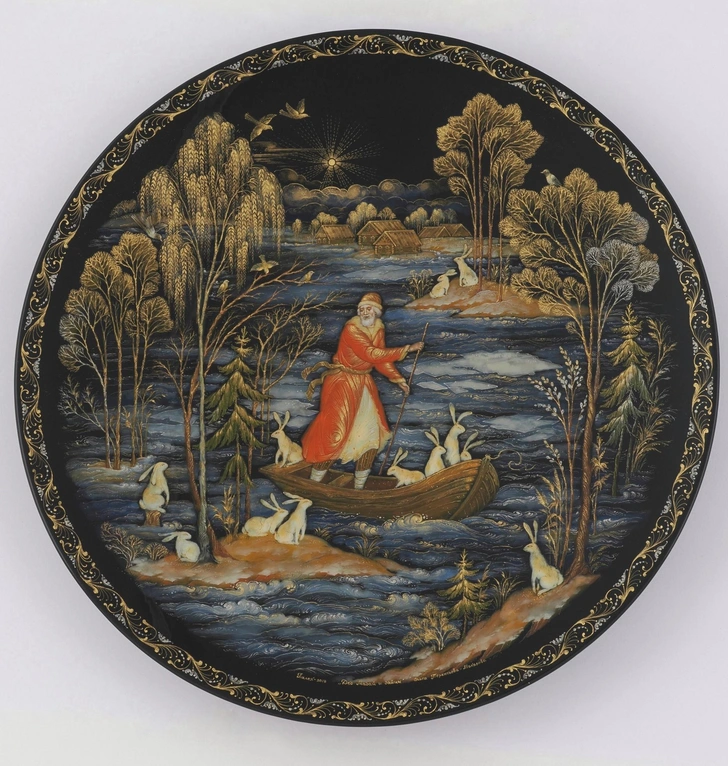 Терентьева Ольга, Декоративная тарелка «Дед Мазай и зайцы». Палех. 2018 г. Частное собрание Бориса Коновалова