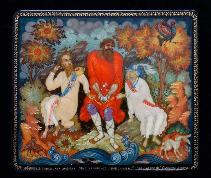 Елкин Виктор, Шкатулка «Повесть о том, как мужик двух генералов прокормил». Холуй. 1982 г. Государственный музей Холуйского искусства