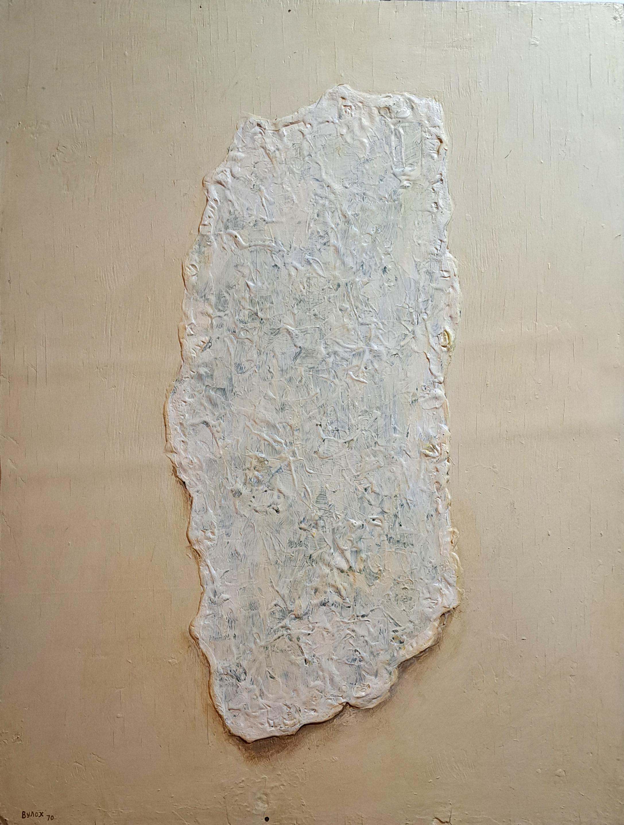 Трещины и разрывы красочного слоя, которые появляются сразу же после его нанесения, включают в работу ощущение времени — живая, дышащая фактура живописного пласта, уподобленного естественным органическим поверхностям земли, кажется достигнутой в результате длительных тектонических процессов.