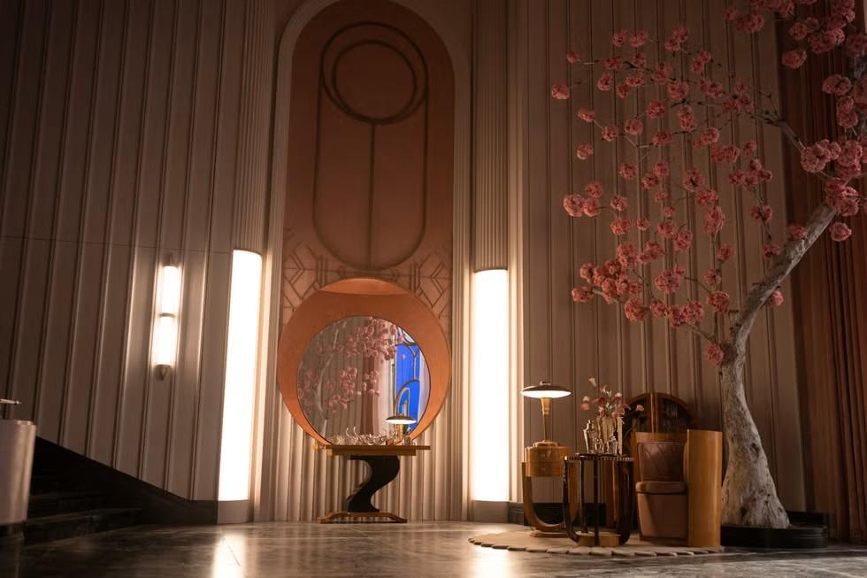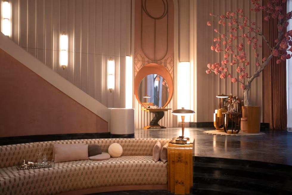 Интерьер апартаментов — это синтез роскоши и точной геометрии. Он наполнен характерными для ар-деко элементами: каннелюрованными колоннами, веерными и волнообразными формами.