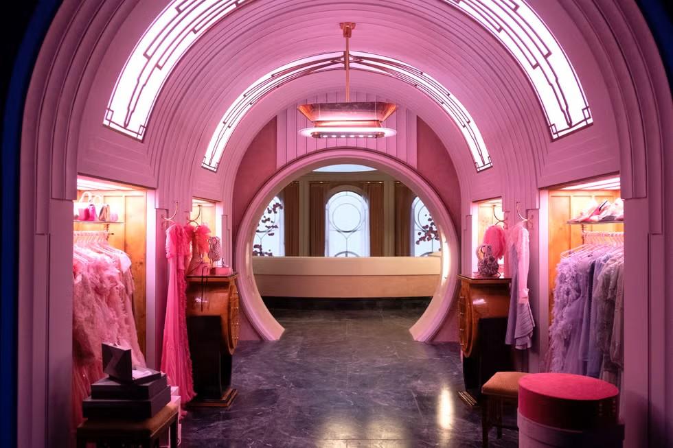 Однако, чтобы передать суть Глинды — ее эмоциональность, театральность и любовь к мягким текстурам — Кроули сделал неожиданный ход. Стены были обтянуты панелями из французского розового шелка, которые превратили холодную архитектурную симметрию в теплое, обволакивающее пространство. «Его мягкость — это и есть Глинда», — поясняет дизайнер.