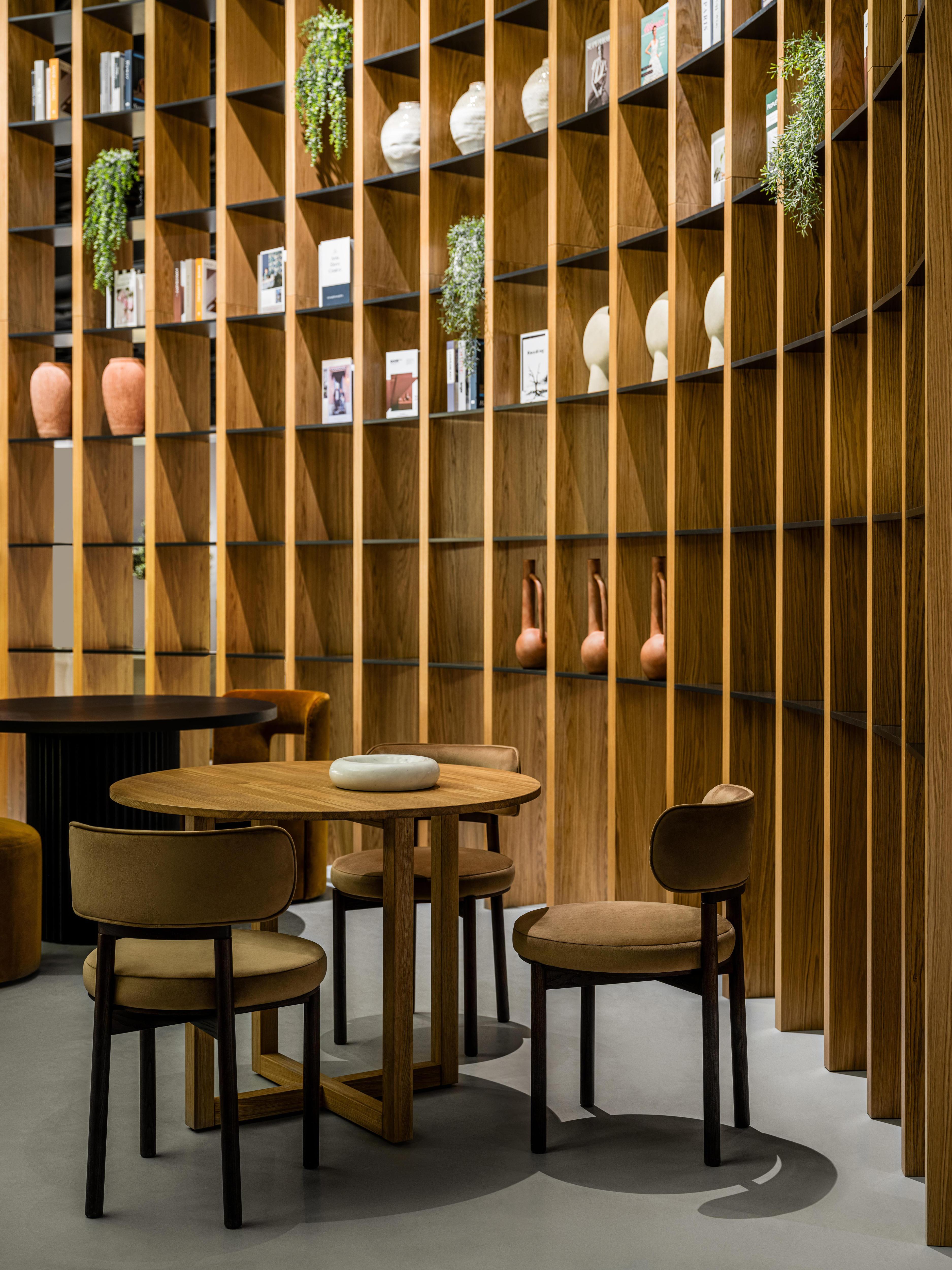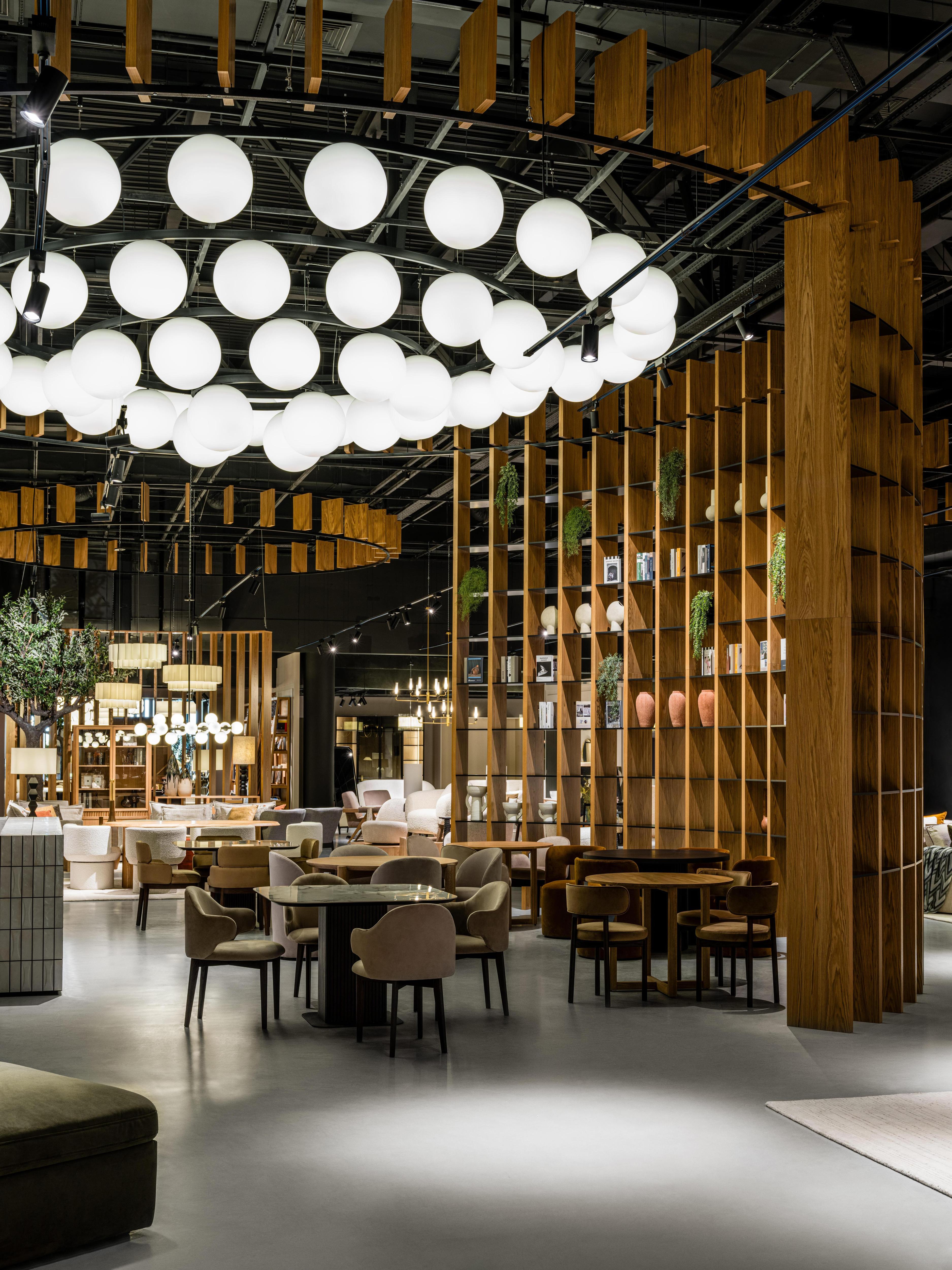 Центром пространства стала круглая кафе-библиотека, где можно отдохнуть, выпить кофе и обсудить свой проект с дизайнером. Дерево, свет и открытые пространства без дверей создают ощущение, что просто пришел в гости, а не в магазин. Здесь приятно провести время, без спешки обдумывая детали своего идеального дома.