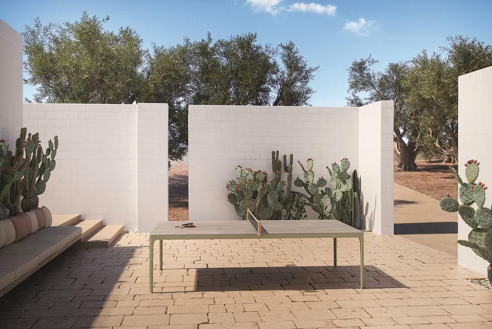 Бренд Ethimo, известный уличной мебелью, разработал универсальный стол Play. Его конструкция позволяет использовать предмет как обеденный стол, а при необходимости — как стол для игры в пинг-понг. Столешница выполнена из керамического камня, а каркас — из алюминия. В комплект входит съемная сетка с боковыми стойками из натурального тика.