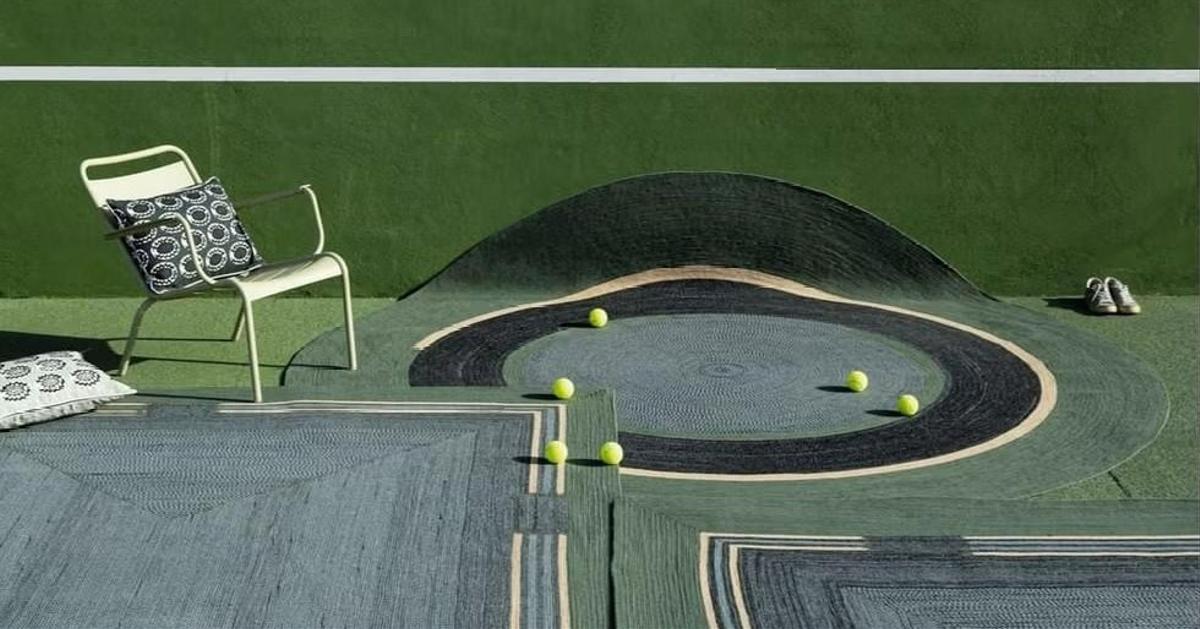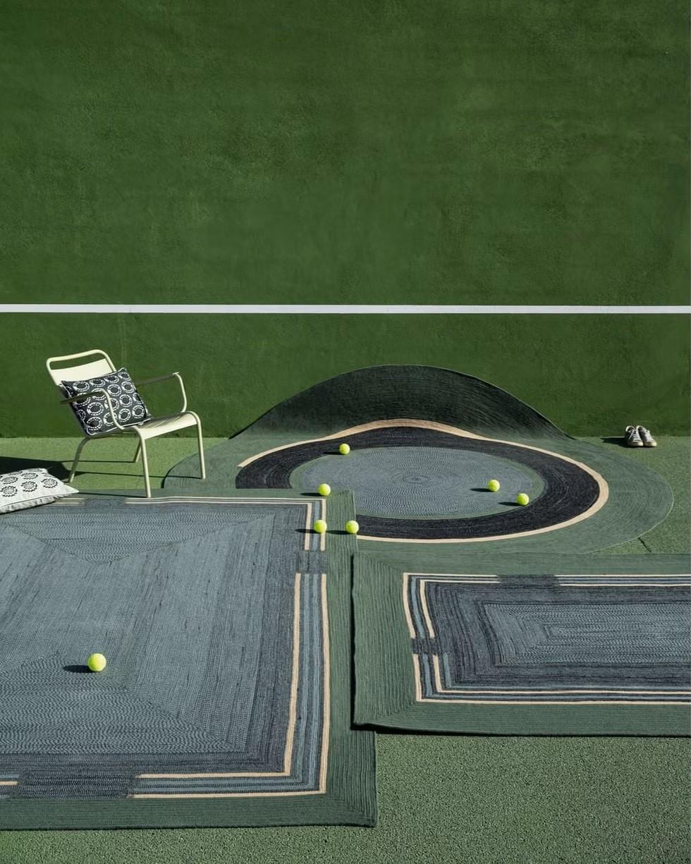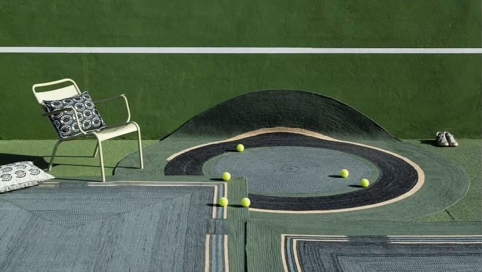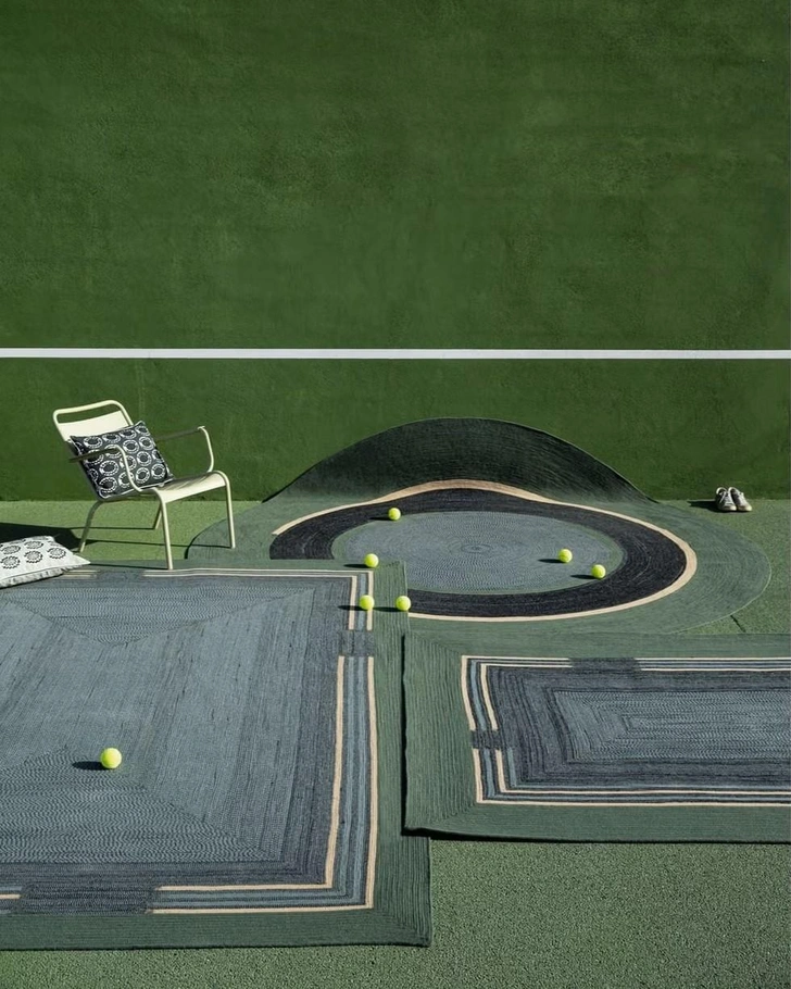 Французская компания Еlitis, специализирующаяся на текстиле для интерьеров, создала коллекцию ковров Disco. Они изготовлены из переработанного пластика, но главной их особенностью стал геометрический рисунок — точное повторение линий, напоминающих разметку теннисного корта. Узор отсылает как к грунтовому покрытию, так и к аккуратно подстриженной траве профессиональных кортов.