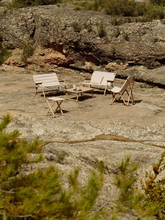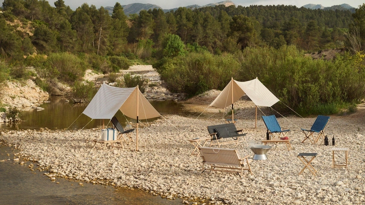 В основе коллекции — легкая буковая древесина для складной мебели, нержавеющая сталь для посуды и мангалов, и полосатый текстиль в трех цветах. Рисунок Моррисон привез с Майорки и из Пиренеев — там он наткнулся на образцы ткани, которые и задали настроение всей линейке.