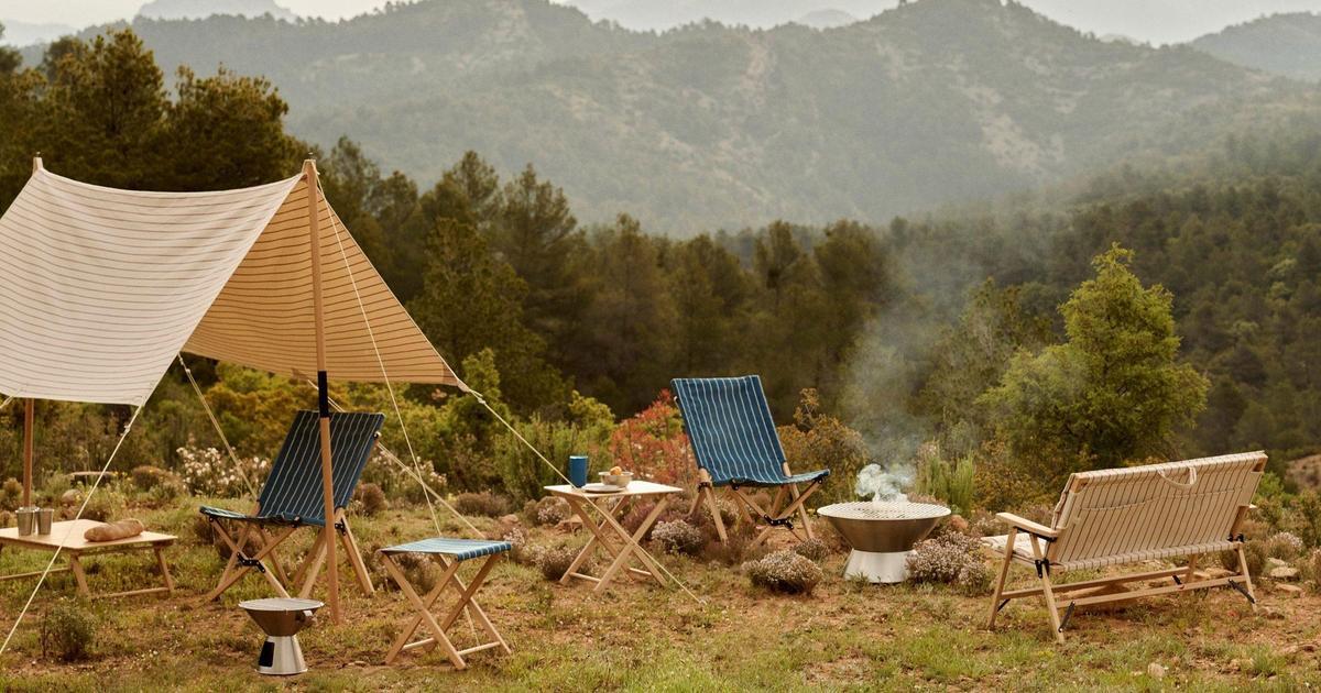 Среди предметов — складные кресла и стулья, диван, который убирается в большую сумку-тоут, тент в форме палатки, мангал, напоминающий рыбу, ящик для шести бутылок, посуда и даже набор метелок, чтобы убирать за собой после пикника.