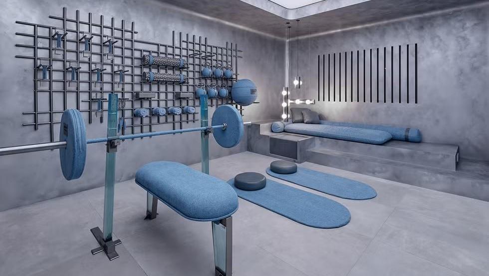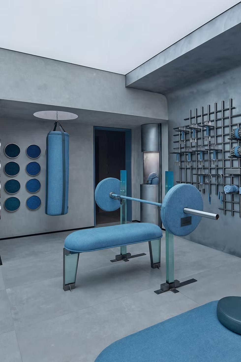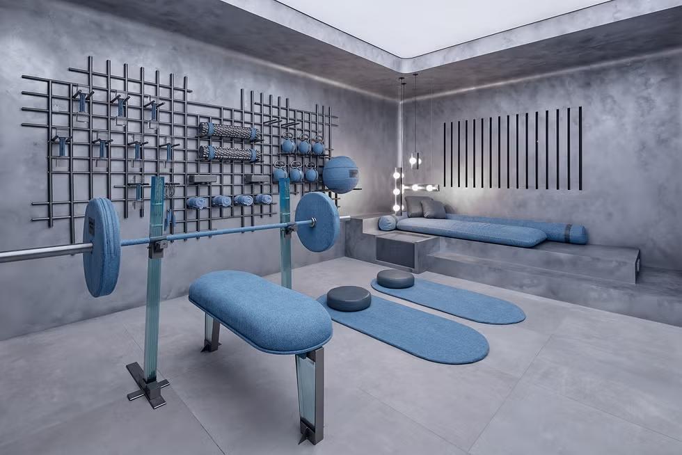 Дизайнер Сулкин Аскеназ и студия Alterego создали инсталляцию-спортзал, где все снаряды и предметы покрыты денимом. Этот материал обтягивает оборудование и механизмы, создавая необычный сценарий. Если в рекламе одежды джинсовая ткань обычно облегает тело, словно вторая кожа, то в проекте Sutura деним покрывает архитектурное пространство. Это превращает спортзал в текстильный ландшафт, где движение тела становится частью эстетической композиции.