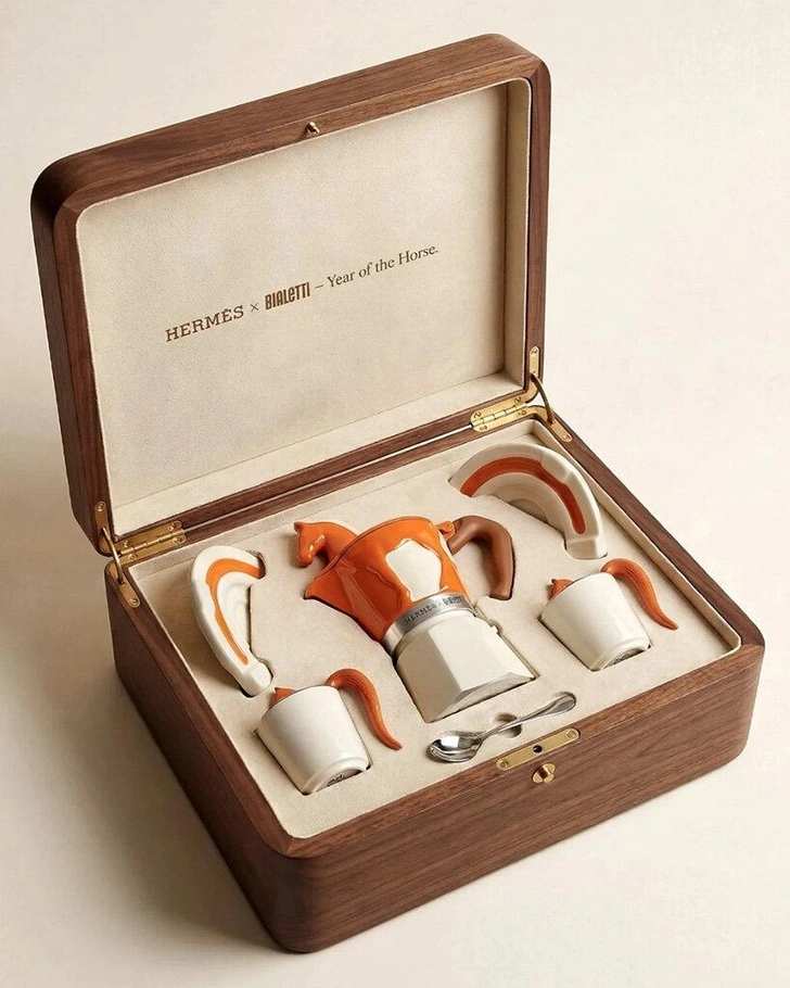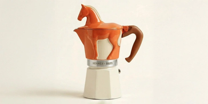 В основе концепции дизайнера Джейн Морелли — классическая гейзерная кофеварка Bialetti, ставшая культовой. Однако в ее варианте верхняя камера выполнена в оранжевом цвете Hermès, а навершием и основой крышки стало скульптурное изображение лошади. Ноги животного спускаются по бокам верхней камеры, превращая кофеварку в небольшую скульптуру.