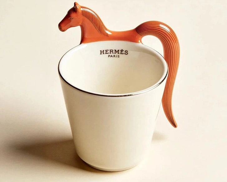 Концепция Hermès x Bialetti Moka Pot продолжилась и в чашке для эспрессо, ручка которой выполнена в виде профиля лошади. Голова венчает ободок, а ребристый хвост изгибается вниз и назад, соединяясь с корпусом чашки.
