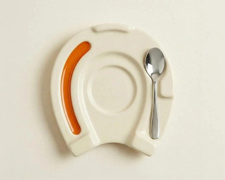 Блюдце сделано в форме подковы. Изогнутая оранжевая вставка проходит вдоль одной стороны, а углубление предназначено для маленькой ложки. Композиция делит столешницу на четко определенные зоны для чашки, столовых приборов и декоративных элементов.