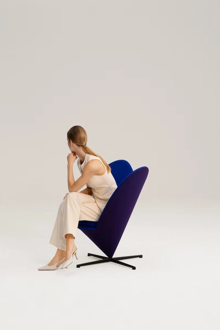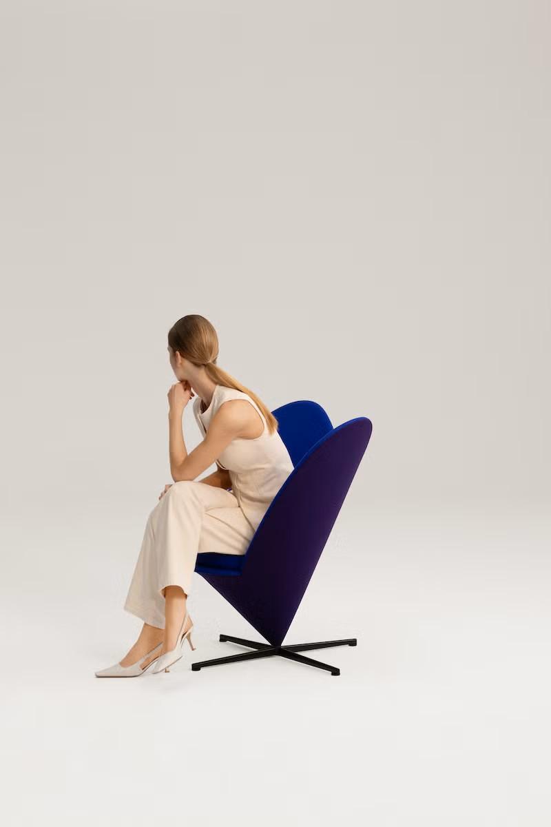 Еще один юбилейный проект к 100-летию Вернера Пантона — лимитированная версия кресла Heart Cone Chair от Vitra. В отличие от оригинальной одноцветной модели, новая получила двухцветную окраску: передняя и задняя стороны теперь разного оттенка синего, что добавляет динамики.