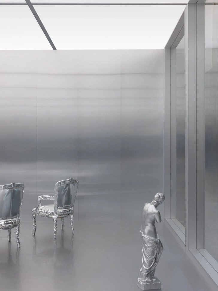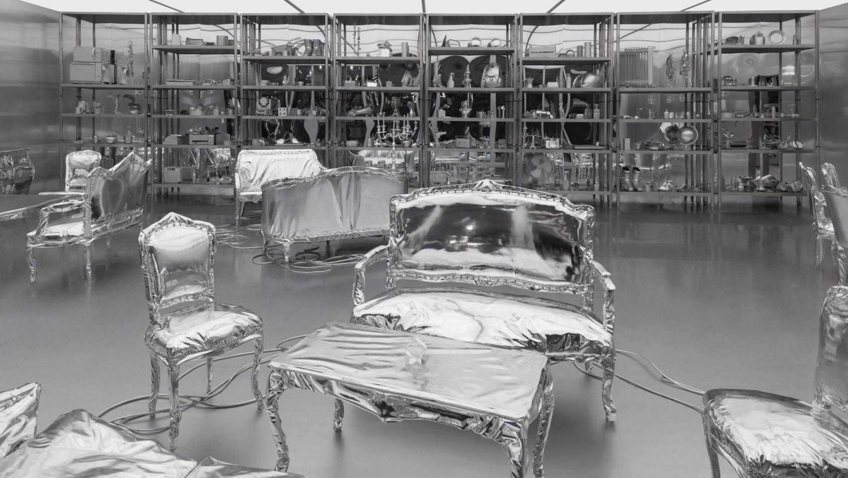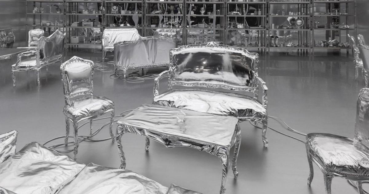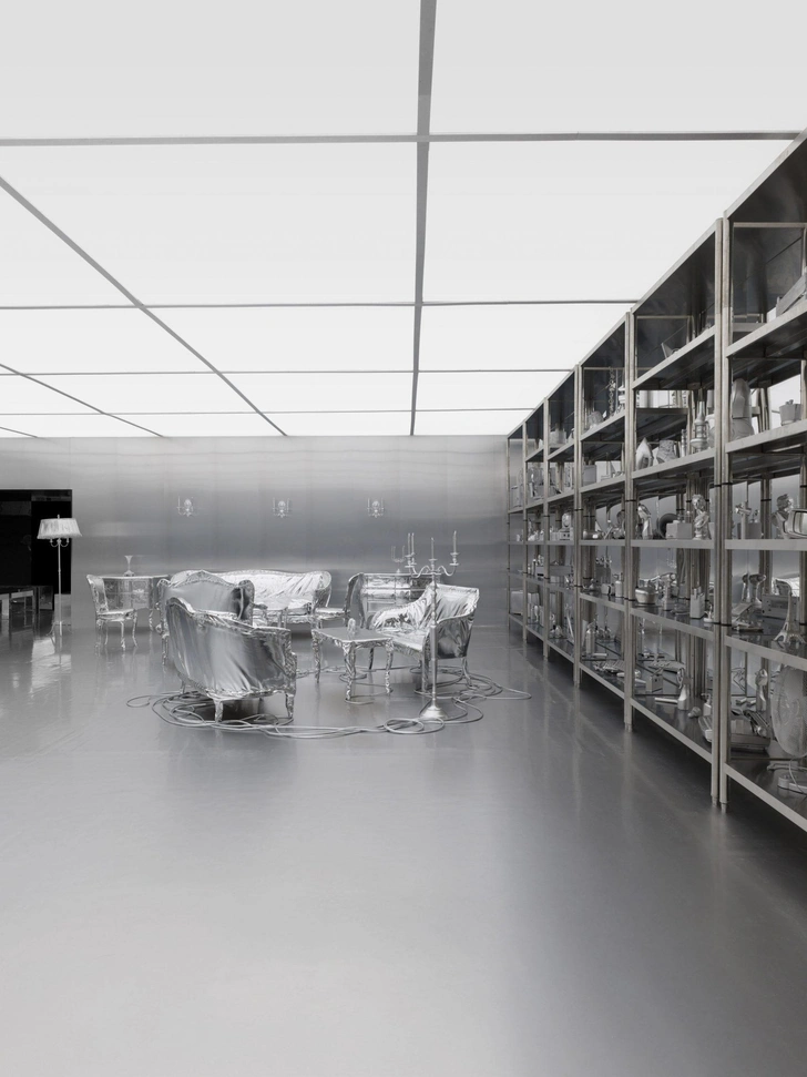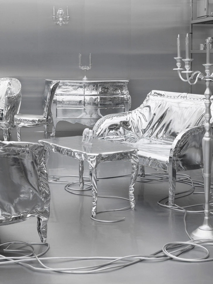 Инсталляция соответствовала теме выставки Maison&Objet 2026 «Прошлое раскрывает будущее»: исторические объекты предстали в футуристичном пространстве, где все было выполнено в металлизированной отделке. Дизайнер покрыл композицию из мебели и предметов блестящей серебристой тканью, создавшей драпировки и отражающие поверхности.