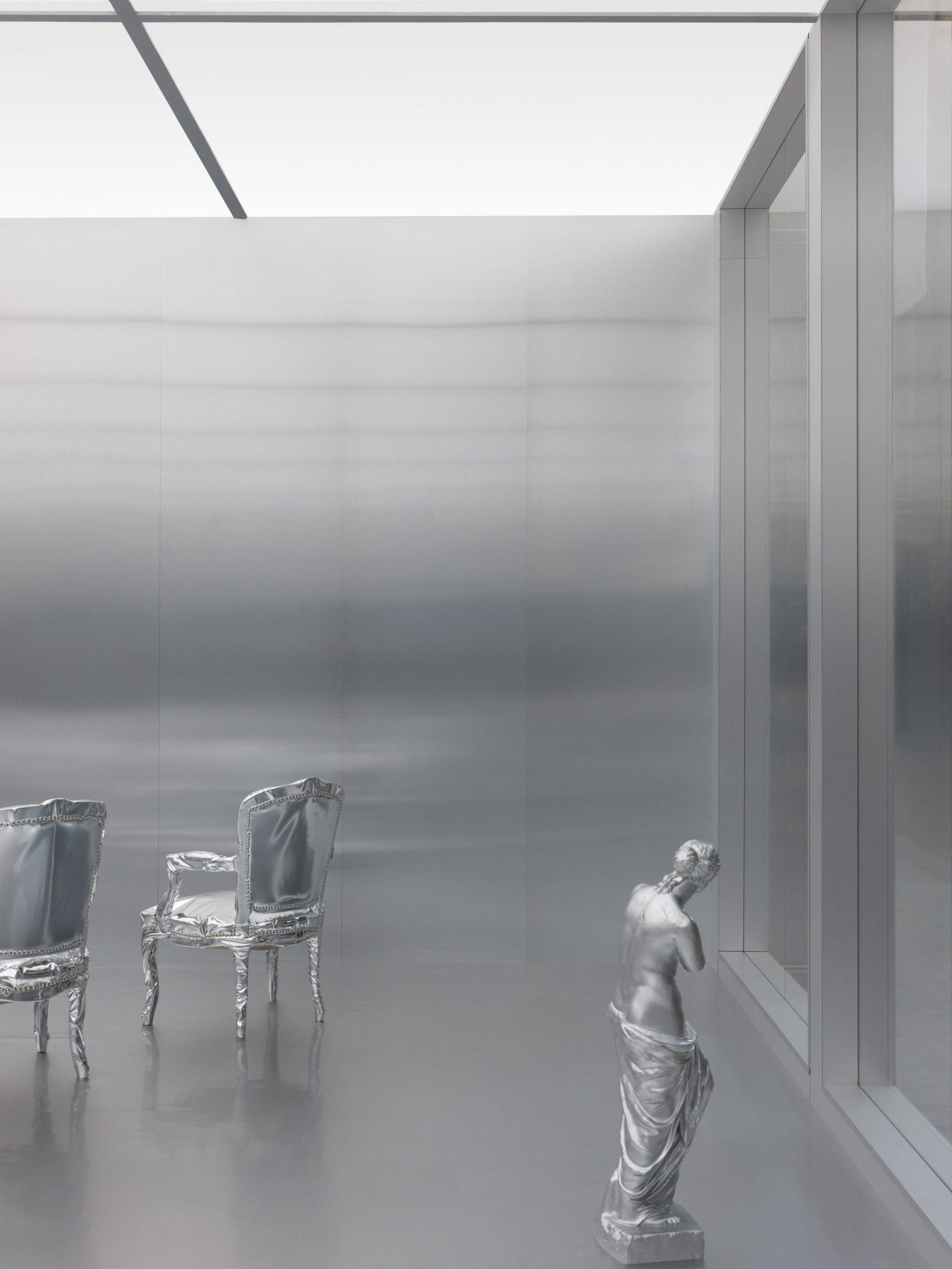 В пространстве, похожем на витрину, дизайнер оставил глянцевый пол и стены, а потолок расчертил «сеткой». Вдоль задней стены Нуриев разместил коллекцию разных предметов, покрытых серебром для создания единой эстетики.