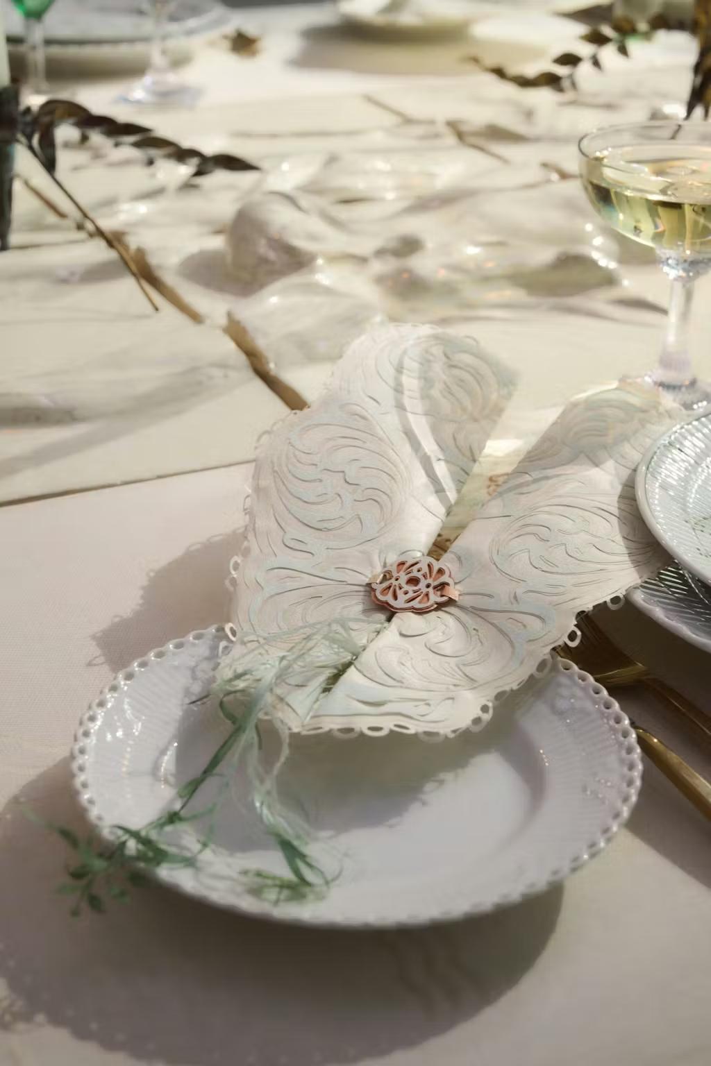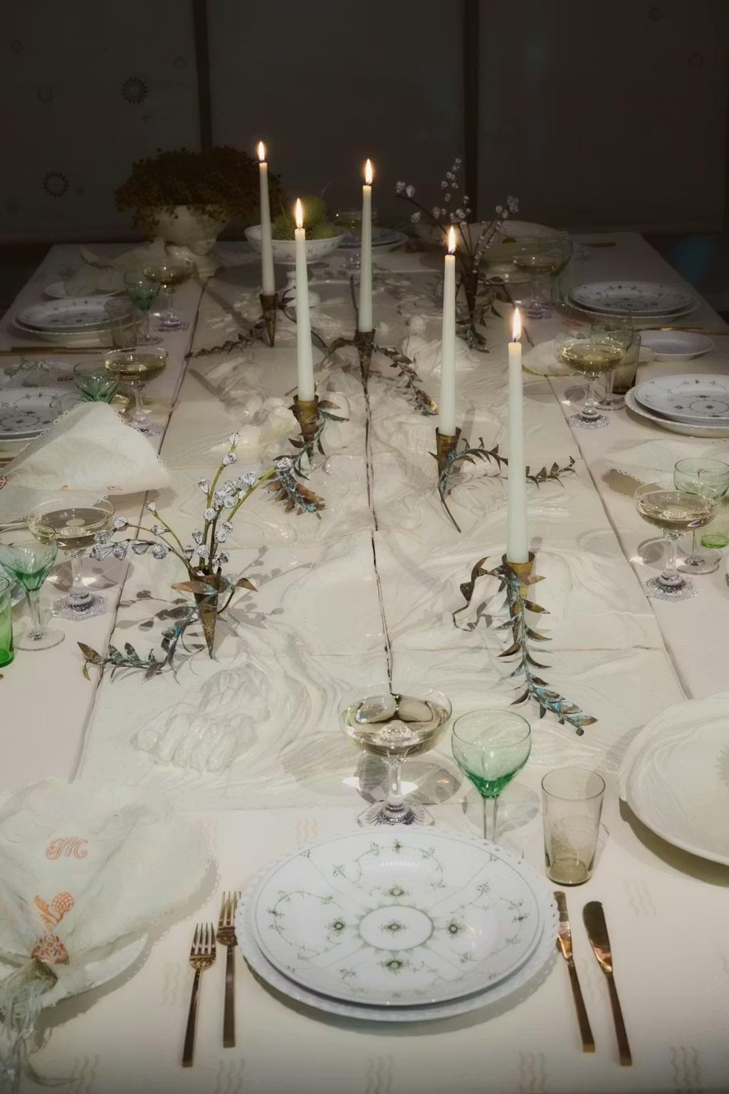 Аманда Бец — архитектор и признанный художник по бумаге. Она интерпретировала знаковые мотивы Royal Copenhagen в форме бумажных фигурок, а салфетки — как небольшие бумажные скульптуры. Однако бумага — не единственный материал художницы: центр стола украшен керамическими фризами с поэтичной резьбой.